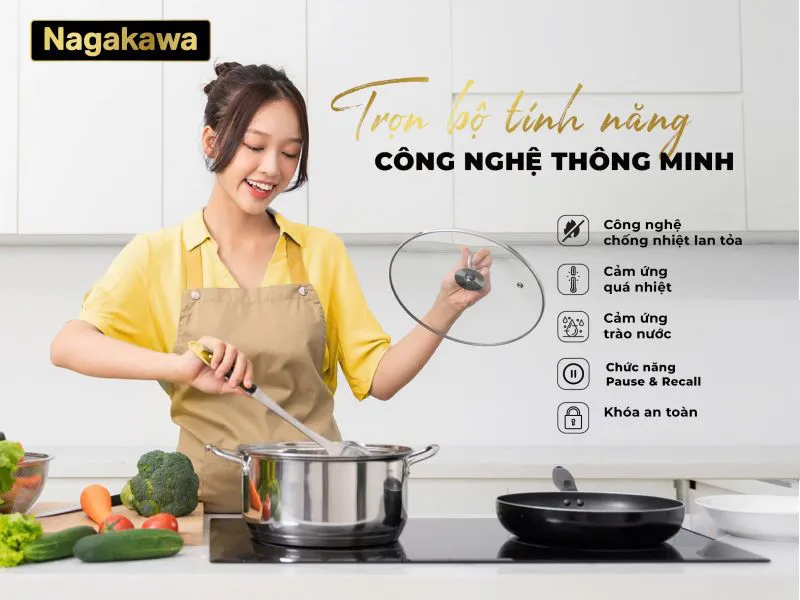 Đặc điểm nổi bật:  - Tự động kết nối và điều khiển với máy hút mùi Nagakawa - Mặt kính Kanger mài vát 4 cạnh sang trọng - Hệ điều hành kép Dual Core mạnh mẽ - Công nghệ Inverter tiết kiệm điện - Chức năng Booster nấu siêu nhanh - Chức năng tạm dừng nấu Pause & Recall - Chương trình nấu cài đặt sẵn tiện lợi - Hẹn giờ nấu từ 1 – 99 phút - Điều khiển Slide & Touch Control dễ dàng sử dụng - Chống nhiệt lan tỏa, tự nhận diện vùng nấu, cảm ứng quá nhiệt, cảm ứng trào nước và khóa an toàn - Made in Malaysia, 1 đổi 1 trong 30 ngày