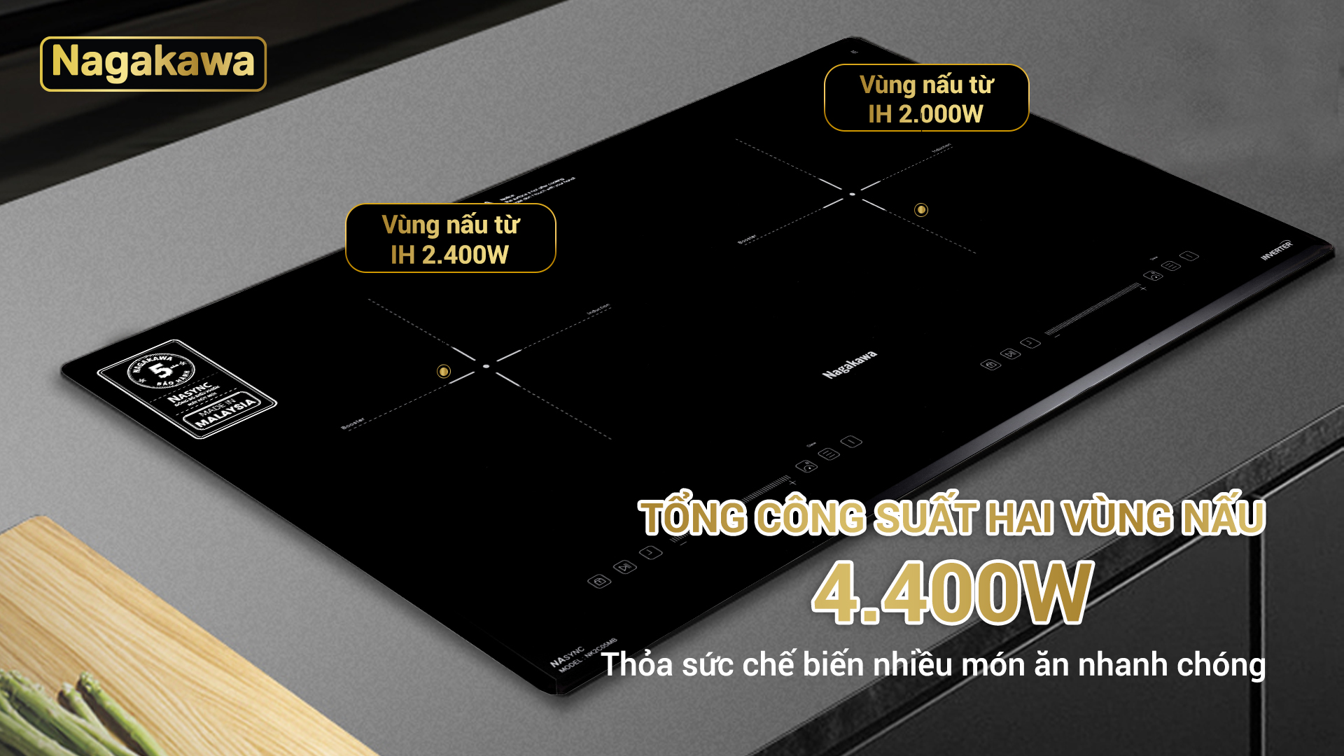 Đặc điểm nổi bật:  - Tự động kết nối và điều khiển với máy hút mùi Nagakawa - Mặt kính Kanger mài vát bo viền kim loại 4 cạnh sang trọng - Công nghệ Inverter tiết kiệm điện - Hệ điều hành kép Dual Core mạnh mẽ - Mâm từ Multi Layer bền bỉ - Chức năng Booster nấu siêu nhanh - Chức năng tạm dừng nấu Pause & Recall - Chương trình nấu cài đặt sẵn tiện lợi - Hẹn giờ nấu từ 1 – 99 phút - Điều khiển Slide & Touch Control dễ dàng sử dụng - Chống nhiệt lan tỏa, tự nhận diện vùng nấu, cảm ứng quá nhiệt, cảm ứng trào nước và khóa an toàn - Made in Malaysia, 1 đổi 1 trong 30 ngày