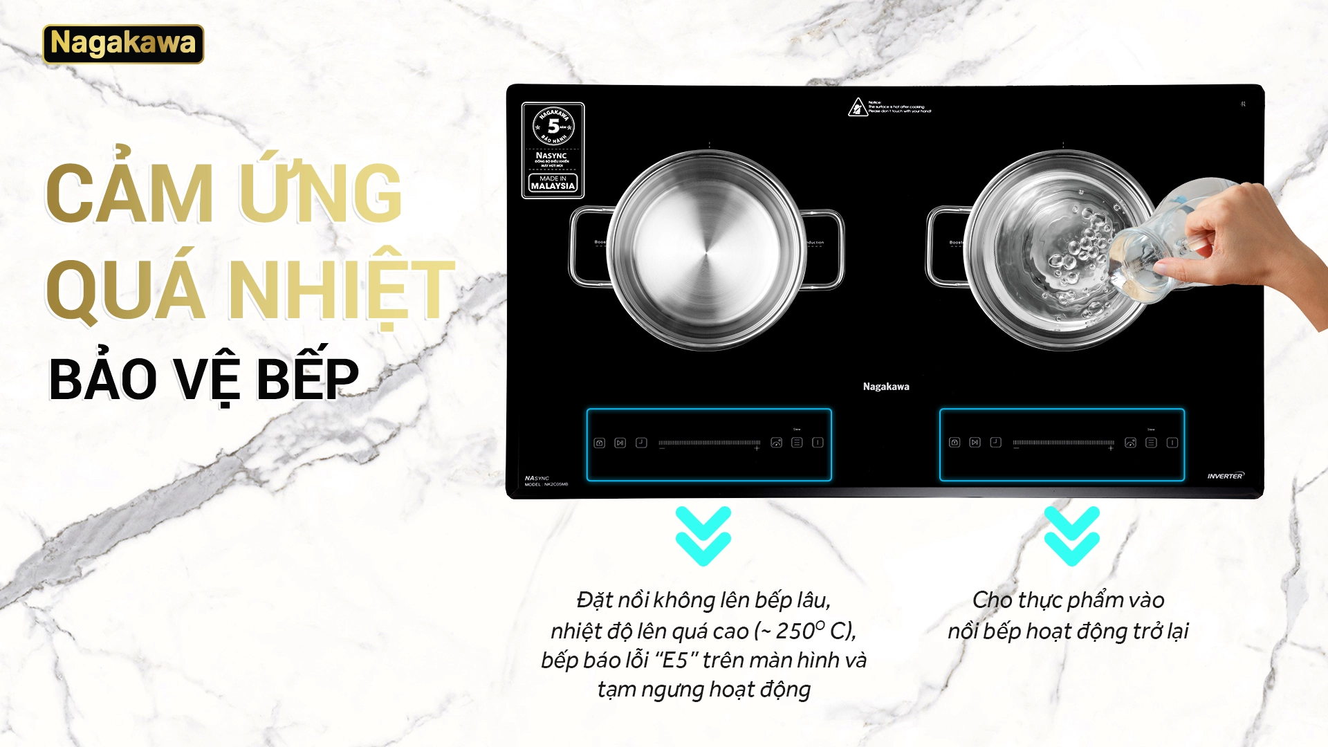 Chức năng chống quá nhiệt góp phần bảo vệ bếp đôi điện từ Nagakawa NK2C05MB, không cho phép sử dụng bếp khi nhiệt độ quá cao. Khi bạn đặt nồi không lên bếp lâu, nhiệt độ lên quá cao (~ 250 độ C), bếp sẽ báo lỗi, sau đó bếp sẽ tự ngừng hoạt động. Bạn có thể nhận diện lỗi với mã báo lỗi “E5” trên màn hình bếp. Lỗi sẽ biến mất khi bạn cho thực phẩm vào nồi hoặc nhiệt độ bếp xuống dưới mức cho phép.