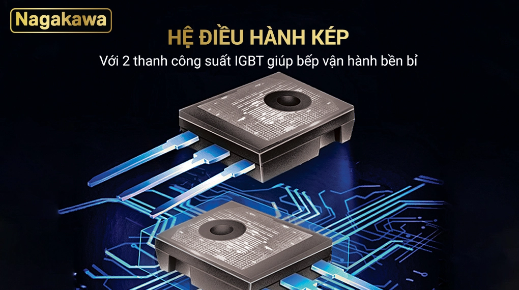 Hệ điều hành kép là ưu điểm vượt trội của bếp đôi điện từ Nagakawa NK2C05MB. Bếp Nagakawa thế hệ mới sử dụng 2 thanh công suất IGBT tạo thành cơ chế hoạt động thông minh: các IGBT có thể hoạt động đồng thời giúp cho bếp có thể đạt công suất tối đa 2400W trong vòng vài giây. Đồng thời, các IGBT có thể hoạt động luân phiên theo lệnh điều hành từ trung tâm, nhờ công nghệ biến tần giúp tiết kiệm năng lượng và đảm bảo tuổi thọ của bếp.