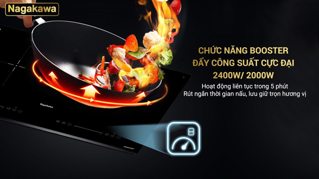 Khi lựa chọn chức năng Booster, công suất bếp đôi điện từ Nagakawa NK2C05MB sẽ nhanh chóng được đẩy lên mức cực đại trong thời gian cực ngắn và hoạt động liên tục trong thời gian 5 phút, giúp rút ngắn tối đa thời gian đun nấu. Cụ thể, công suất bếp mặc định ở mức 1 là 400W, nếu chọn chức năng Booster, bếp nhanh chóng đạt công suất cực đại từ 2400W.