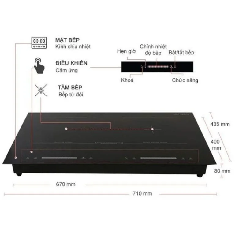 • Công suất tổng: 5400W. Vùng bếp từ dưới: 2000W, Vùng bếp từ trên: 1200W, Vùng bếp hồng ngoại: 2200W