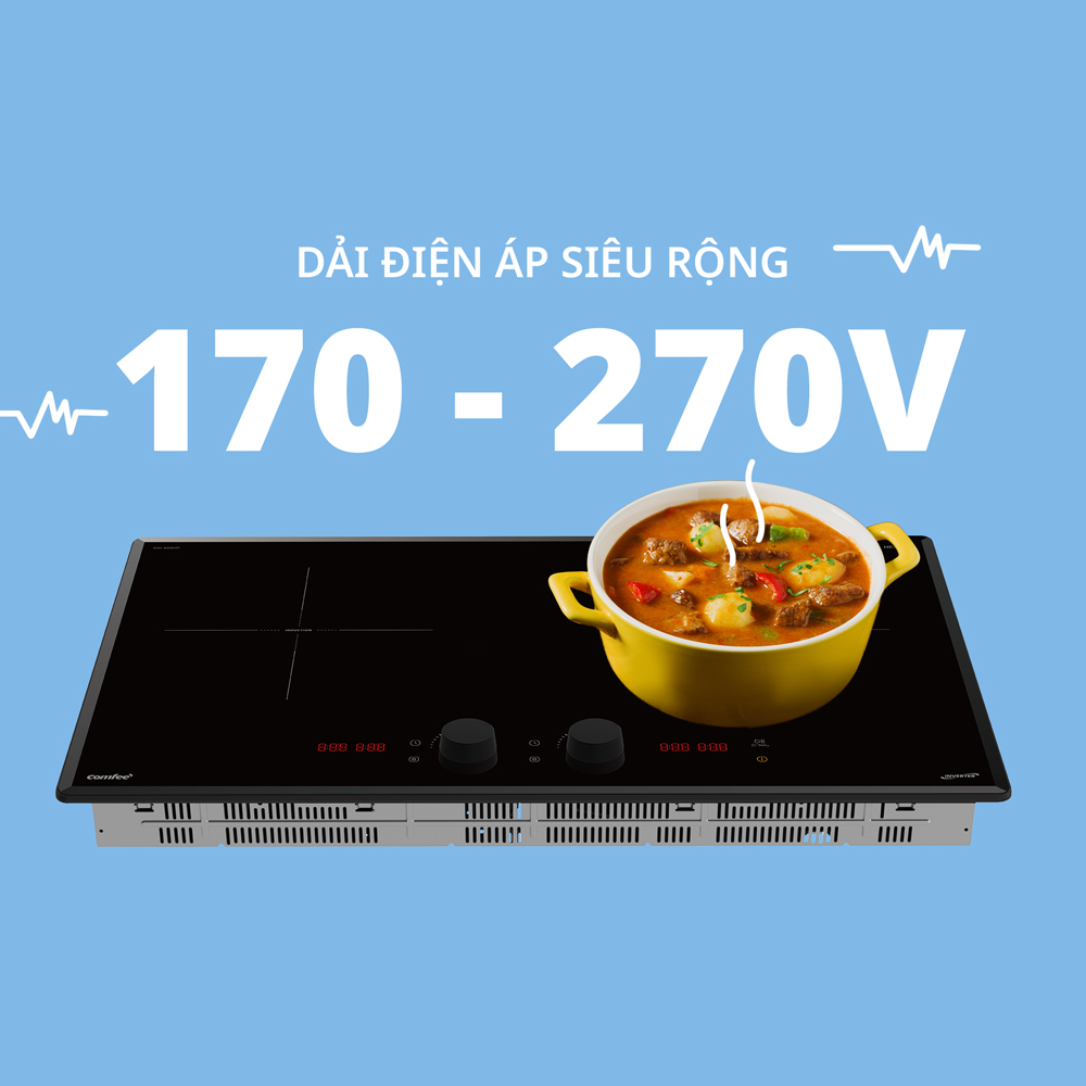 Dải điện áp siêu rộng từ 170V – 270V cho phép bếp từ thông minh Comfee CIH-52DHP hoạt động ổn định trong thời điểm cao điểm tiêu thụ điện tại đô thị hoặc khi thiếu hụt nguồn cung cấp điện ở các vùng xa.