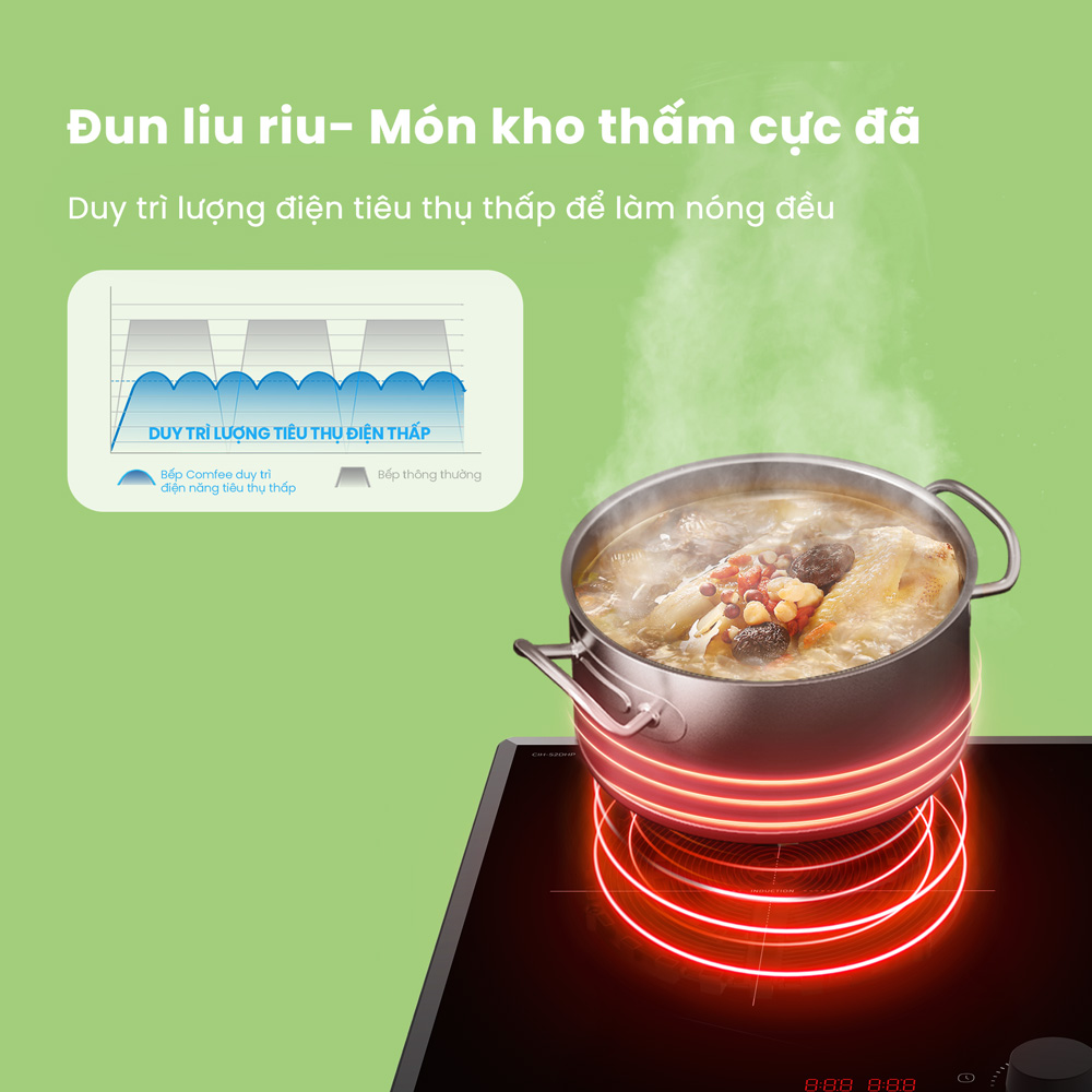 Khi nấu ở mức công suất thấp, bếp từ Comfee CIH-52DHP giúp duy trì nhiệt độ ổn định, làm cho các món hầm và kho trở nên mềm mịn, thấm gia vị và đậm đà hơn.