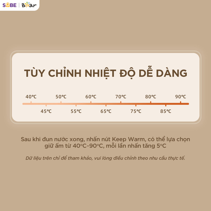 Bình có thể điều chỉnh nhiệt độ dễ dàng từ 40°C đến 100°C, đáp ứng mọi nhu cầu sử dụng nước nóng từ mẹ bỉm pha sữa cho con hay người lớn dùng pha trà. Bình có chức năng giữ ấm thông minh, sau khi đun sôi sẽ tự động chuyển sang chế độ giữ ấm cả ngày để luôn sẵn sàng nước ấm cho gia đình.
