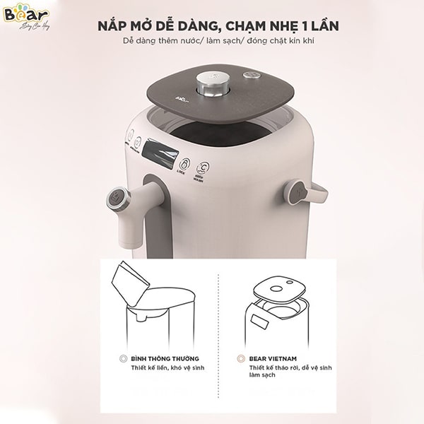 Bình thủy điện Bear rất dễ sử dụng với phần nắp được thiết kế độc đáo và hoàn toàn khác biệt so với các sản phẩm cạnh tranh trên thị trường. Người dùng chỉ cần ấn nhẹ để mở khóa và nhấc nắp bình lên là có thể sử dụng.