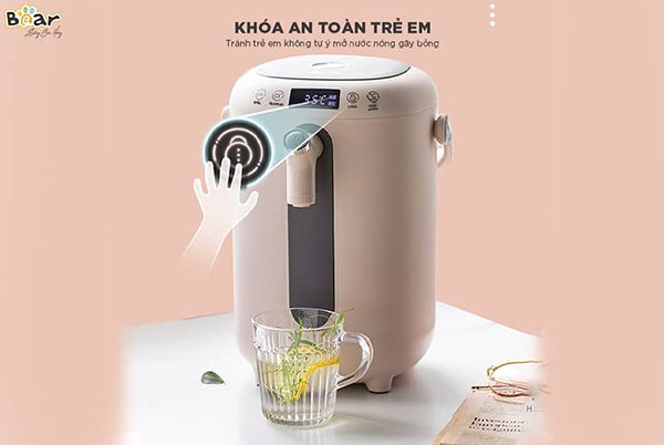 Điểm nhấn nổi bật của chiếc bình này là nó được trang bị khóa an toàn cho trẻ em thông minh. Bạn chỉ cần nhấn nút khóa an toàn trên thân bình là vòi sẽ tự động khóa không cho lấy nước, nhằm đảm bảo an toàn, tránh sự nghịch ngợm của trẻ em.