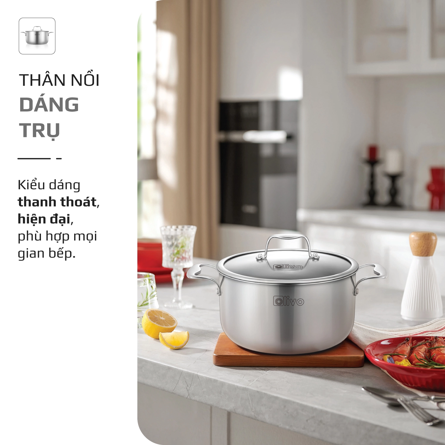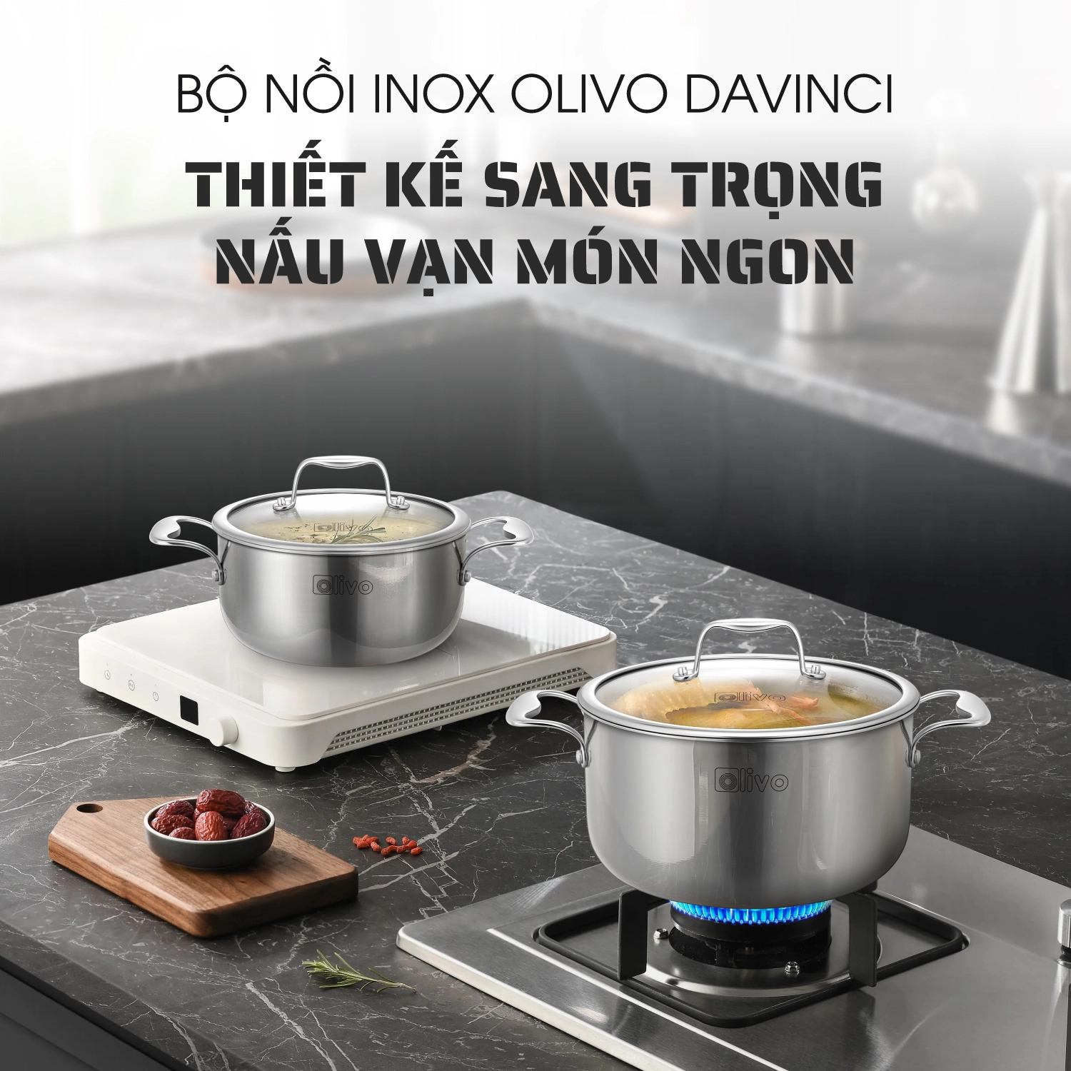 - Từ chất liệu inox 304 nguyên khối cao cấp, thiết kế dáng trụ tinh tế đến khả năng dẫn nhiệt nhanh, giữ nhiệt lâu – bộ nồi inox OLIVO Davinci là lựa chọn hoàn hảo cho căn bếp hiện đại. Vừa mang vẻ đẹp sang trọng, chuẩn phong cách châu Âu, vừa linh hoạt với hai kích thước 20cm và 24cm, Davinci giúp bạn nấu vạn món ngon mỗi ngày, nâng tầm trải nghiệm nấu nướng và chăm sóc gia đình.