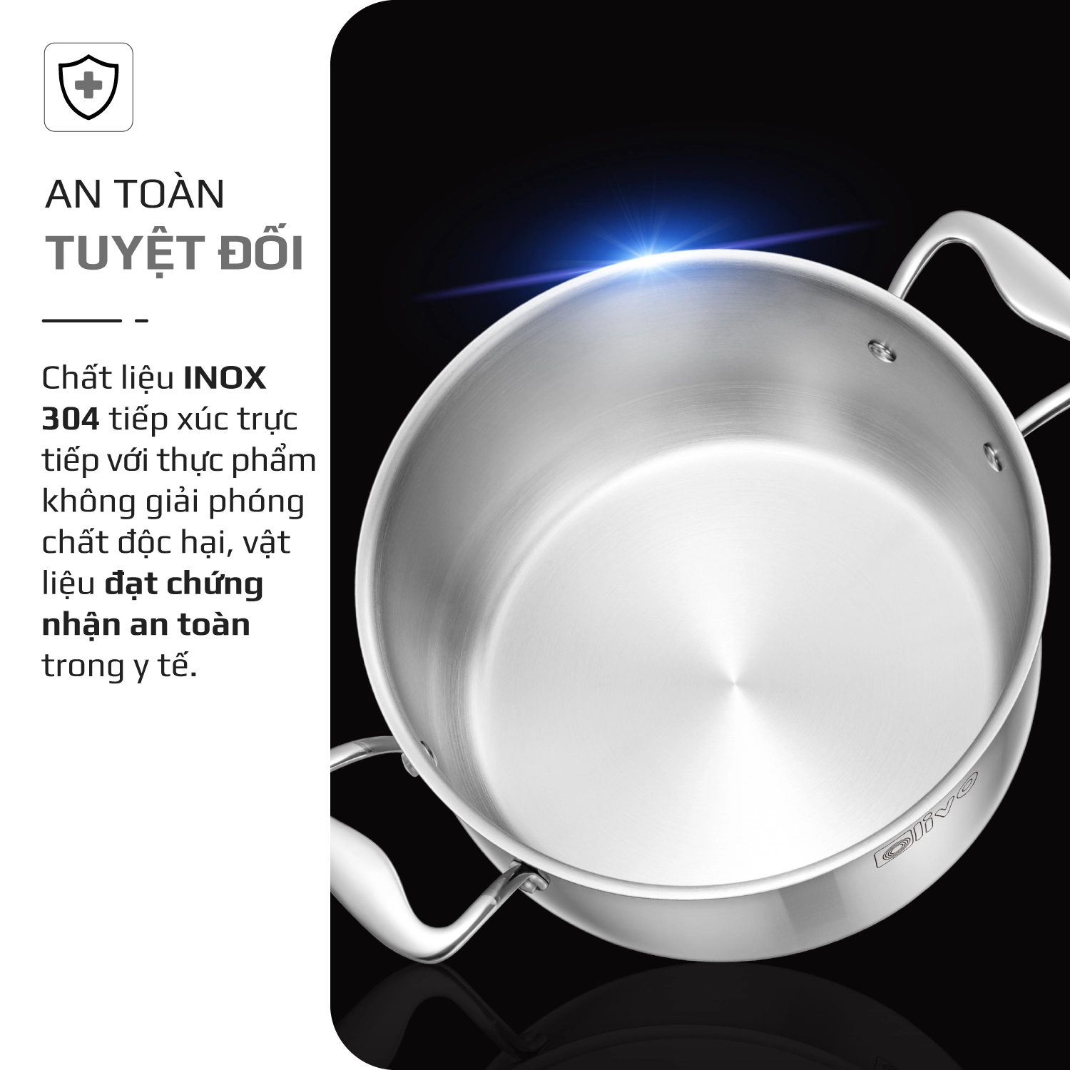 - Phần inox tiếp xúc trực tiếp với thực phẩm được làm từ inox 304 cao cấp, chất liệu đạt chứng nhận an toàn y tế, thường được sử dụng trong dụng cụ y khoa và thiết bị chế biến thực phẩm, đảm bảo không thôi nhiễm kim loại khi đun nấu ở nhiệt độ cao.