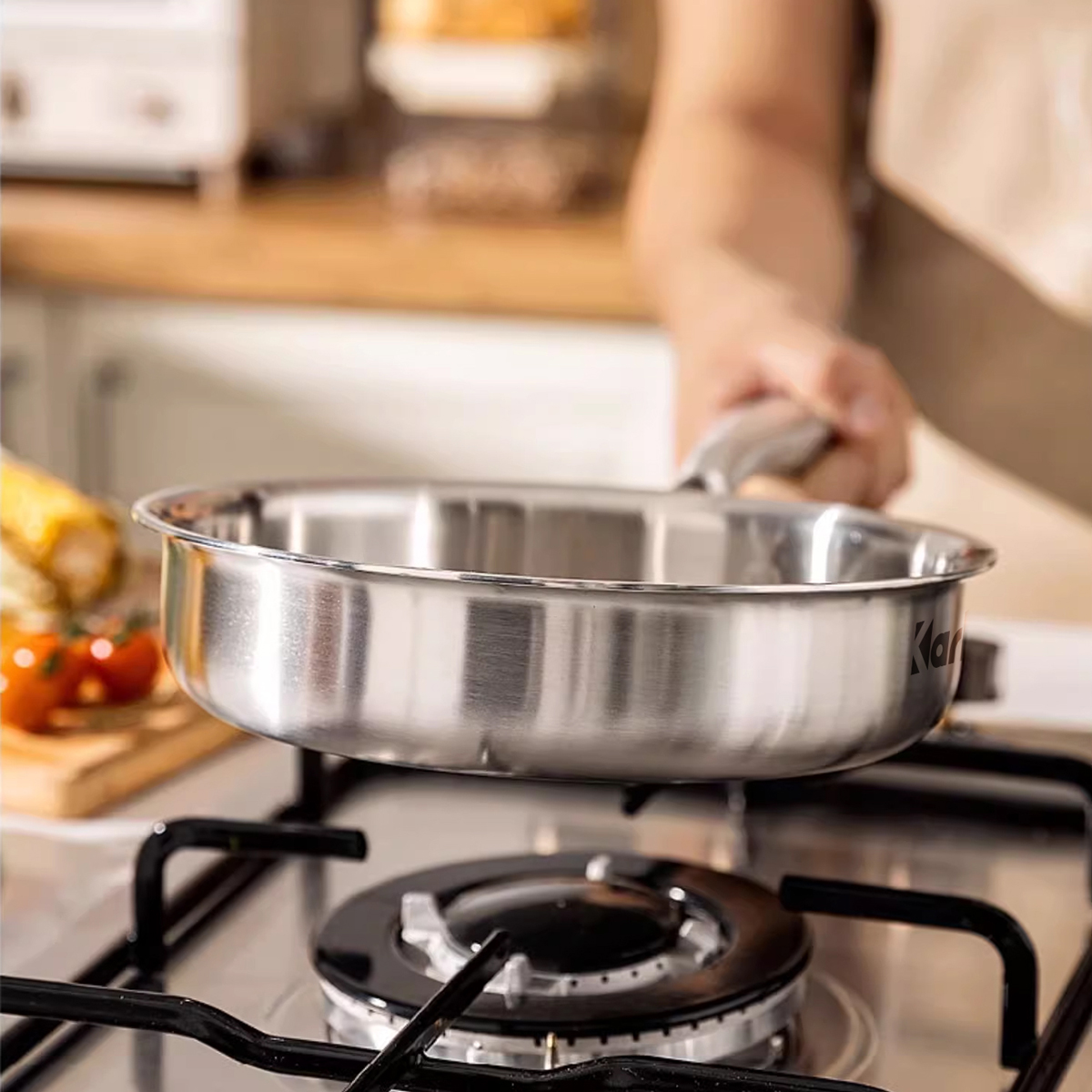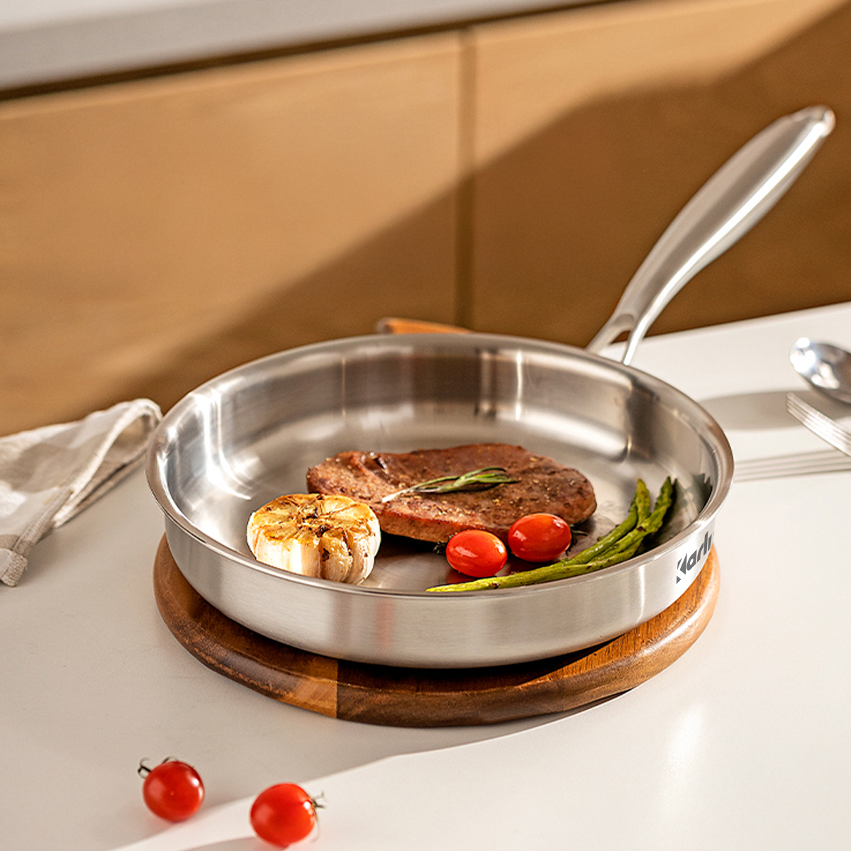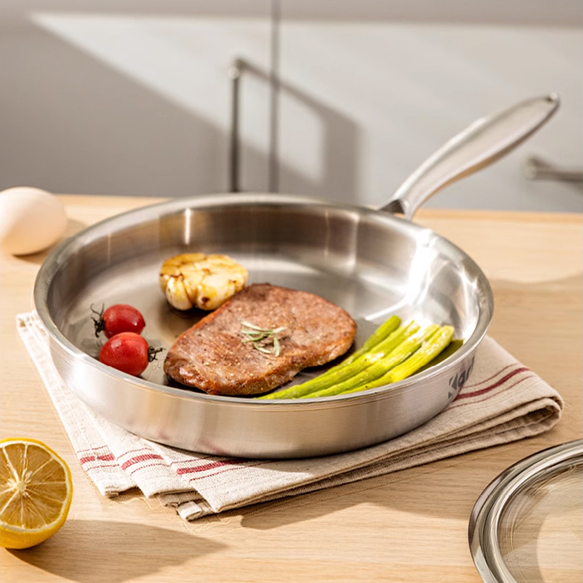 + Lớp bên trong lòng nồi: làm từ inox 304 cao cấp, không phủ lớp chống dính hóa học, giúp nhiệt lan tỏa đều khắp lòng chảo và thời gian giữ nhiệt lâu tiết kiệm năng lượng