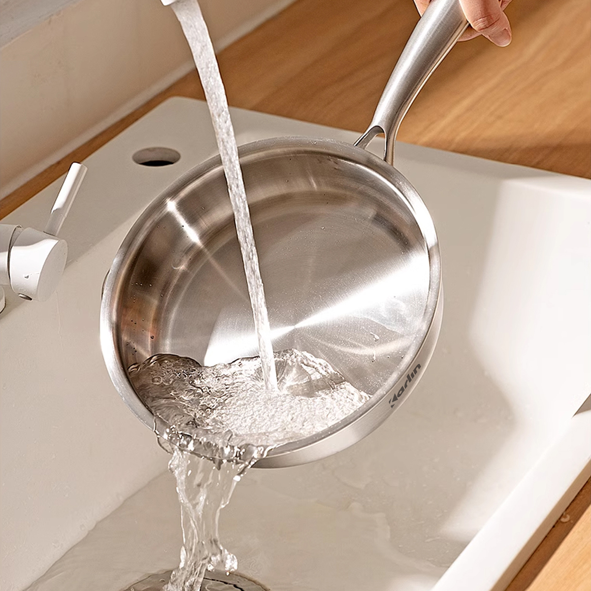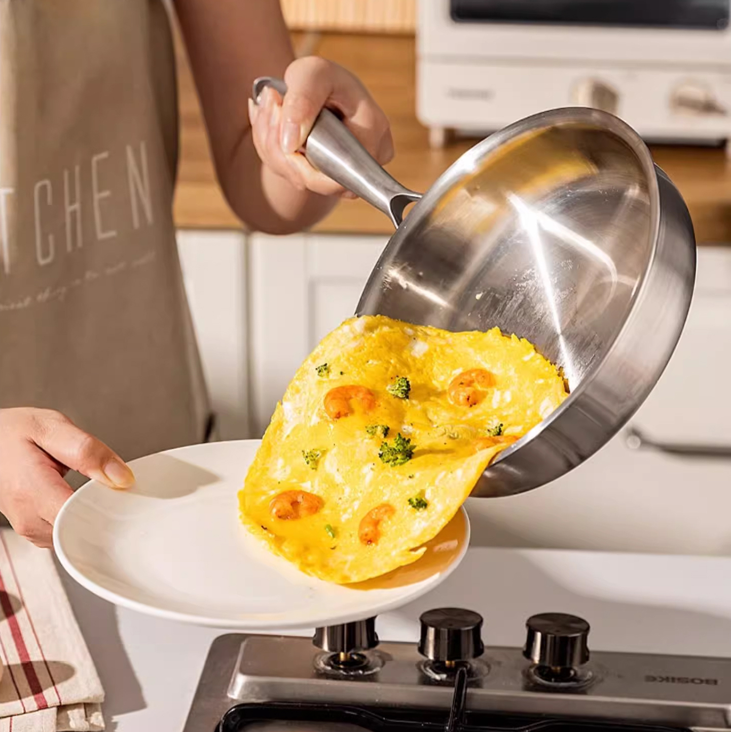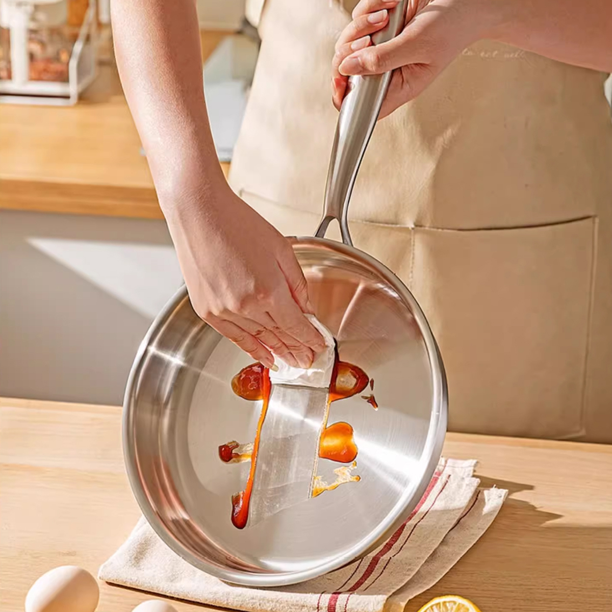 + Lớp bên trong lòng nồi: làm từ inox 304 cao cấp, không phủ lớp chống dính hóa học, giúp nhiệt lan tỏa đều khắp lòng chảo và thời gian giữ nhiệt lâu tiết kiệm năng lượng