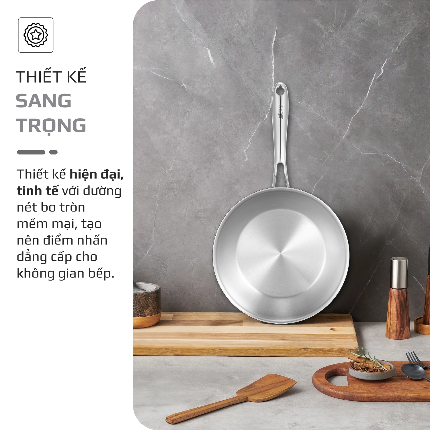 Chảo không bị ố vàng hay hoen gỉ sau một thời gian dài sử dụng, luôn giữ được vẻ đẹp sáng bóng, sạch sẽ. Điều này không chỉ tiết kiệm thời gian cho việc dọn dẹp mà còn giúp căn bếp của bạn luôn gọn gàng, hiện đại.