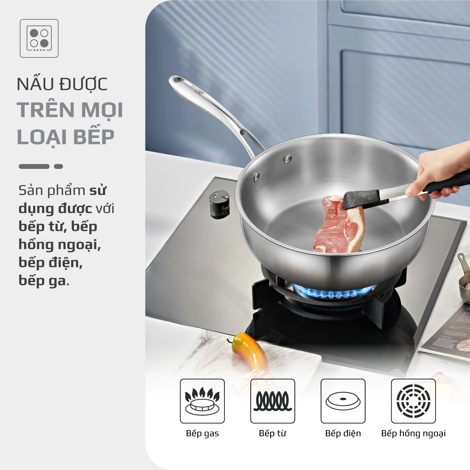 Sản phẩm có thể sử dụng trên nhiều loại bếp khác nhau như bếp từ, bếp ga, bếp điện hay bếp hồng ngoại. Điều này mang lại sự linh hoạt tối đa cho bạn, dù bạn sử dụng bếp nào, sản phẩm vẫn hoạt động hiệu quả. Đây là một điểm cộng lớn cho những ai có nhu cầu nấu nướng đa dạng và tiện lợi.