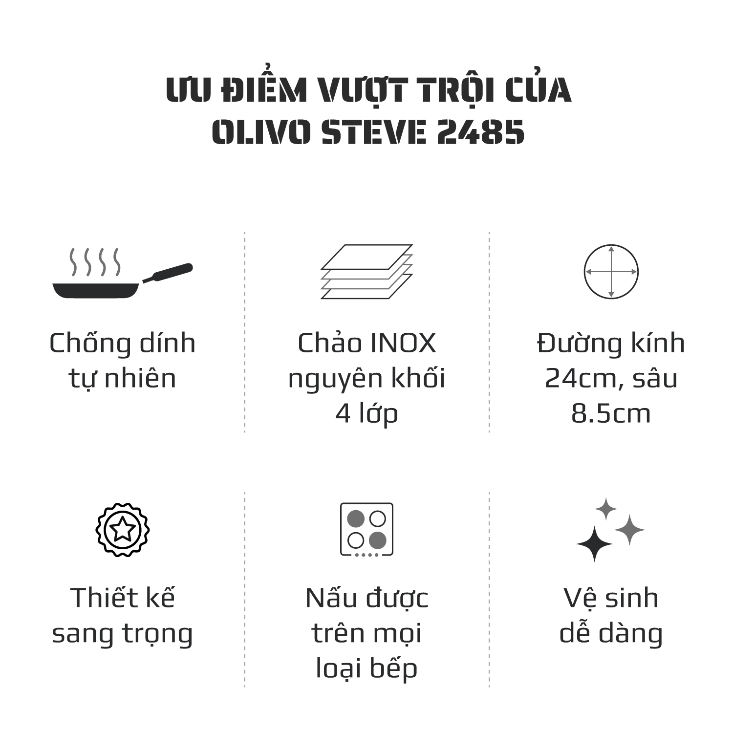 Hãy chọn ngay Chảo INOX OLIVO STEVE 2485 để nâng cao chất lượng bữa ăn của bạn và trải nghiệm sự tiện lợi trong việc nấu nướng hàng ngày!