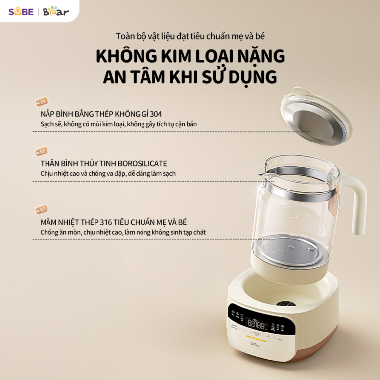 - Mâm nhiệt thép 316: Không bị gỉ sét hoặc giải phóng kim loại nặng khi đun nước, an toàn khi đun nước pha sữa cho bé.