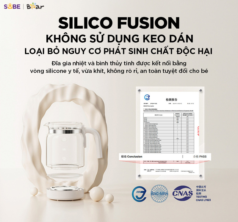 • Công nghệ SilicoFusion:Máy không sử dụng keo dán. Bình thủy tinh và mâm nhiệt được kết nối bằng vòng silicone thực phẩm, đảm bảo không rò rỉ, an toàn tuyệt đối.