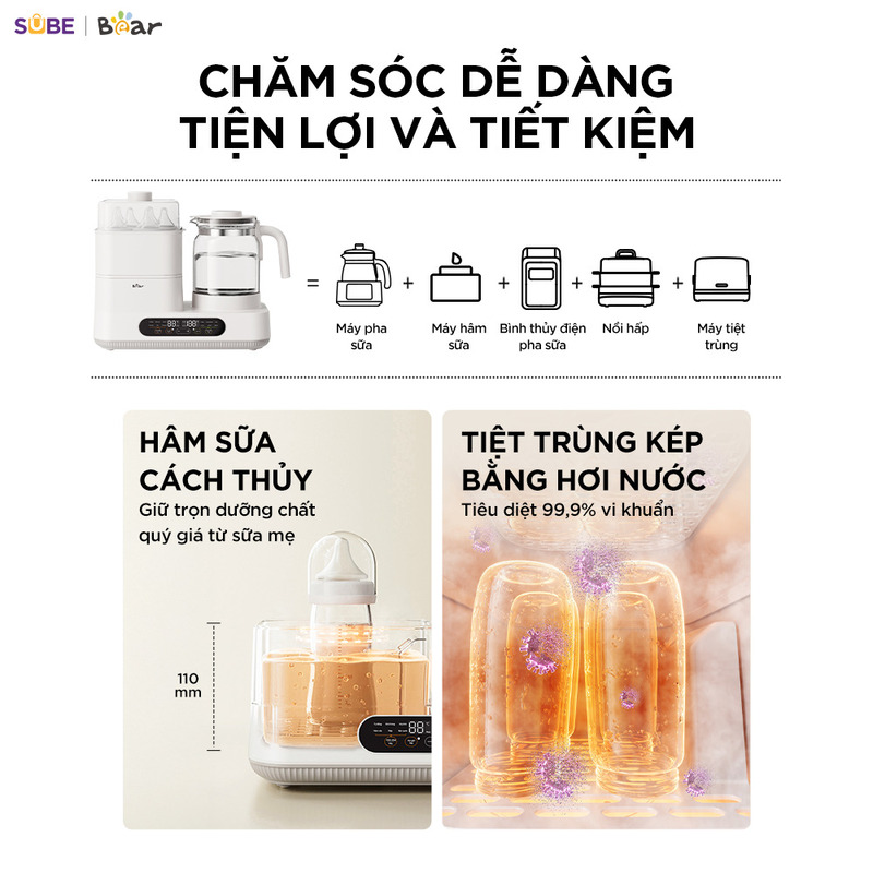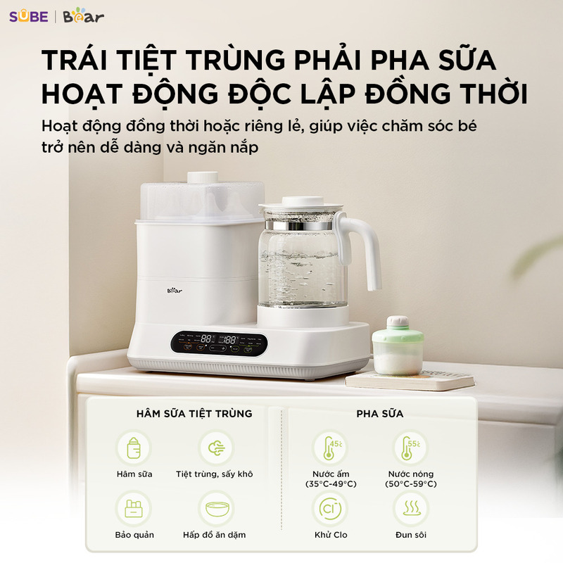 • Bên trái (Tiệt trùng/Hâm sữa): Chuyên dụng cho việc tiệt trùng, sấy khô, hấp thức ăn, hâm sữa mẹ hoặc thức ăn dặm.