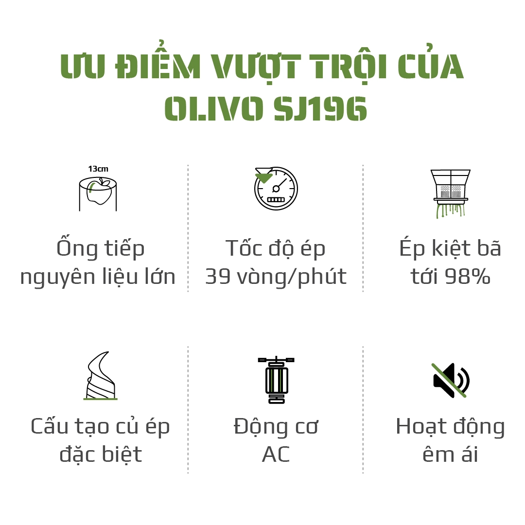 • OLIVO SJ196 là dòng máy ép công nghệ mới từ Mỹ có khả năng ép kiệt đến 98% cùng thiết kế trang nhã, sang trọng. Đặc biệt với phần ống tiếp nguyên liệu rất lớn lên tới 13cm có thể ép trái cây nguyên trái giúp tiết kiệm thời gian sơ chế. Máy sử dụng động cơ AC Motor cao cấp vì vậy hoạt động vô cùng êm ái đem lại trải nghiệm hoàn toàn khác biệt cho người dùng. OLIVO SJ196 hứa hẹn sẽ làm hài lòng cả những khách hàng khó tính nhất.