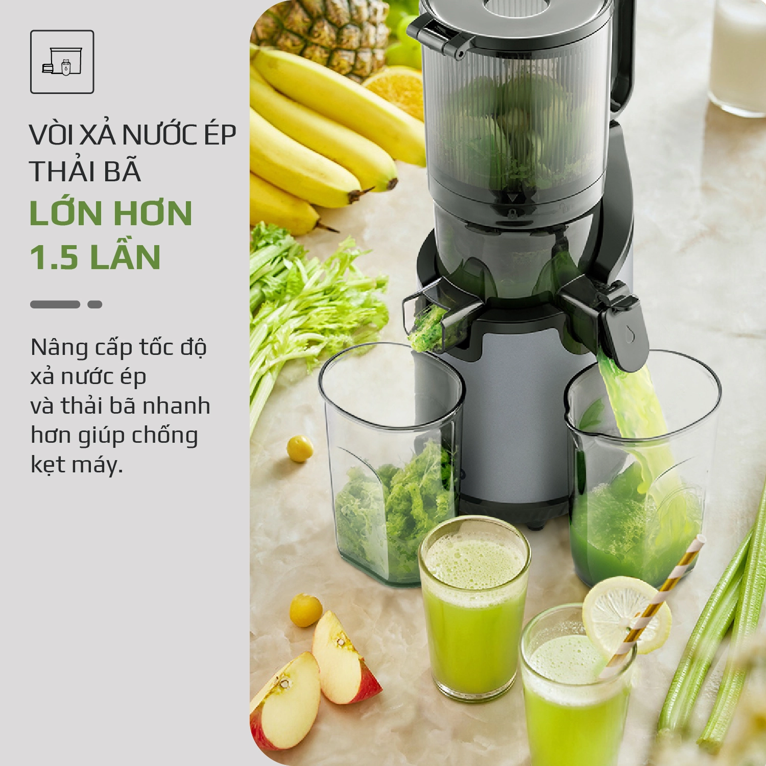 • Phiên bản mới nâng cấp tốc độ xả nước ép và thải bã chống kẹt máy bằng việc thiết kế vòi xả nước và thải bã rất lớn, thuận tiện hơn trong quá trình sử dụng.