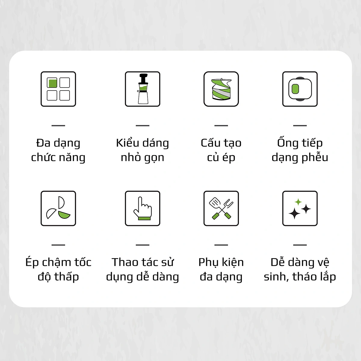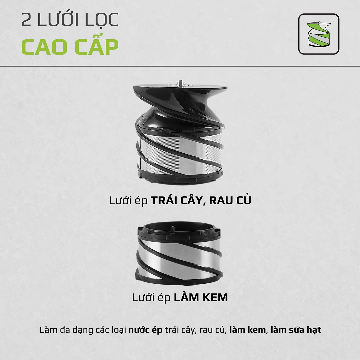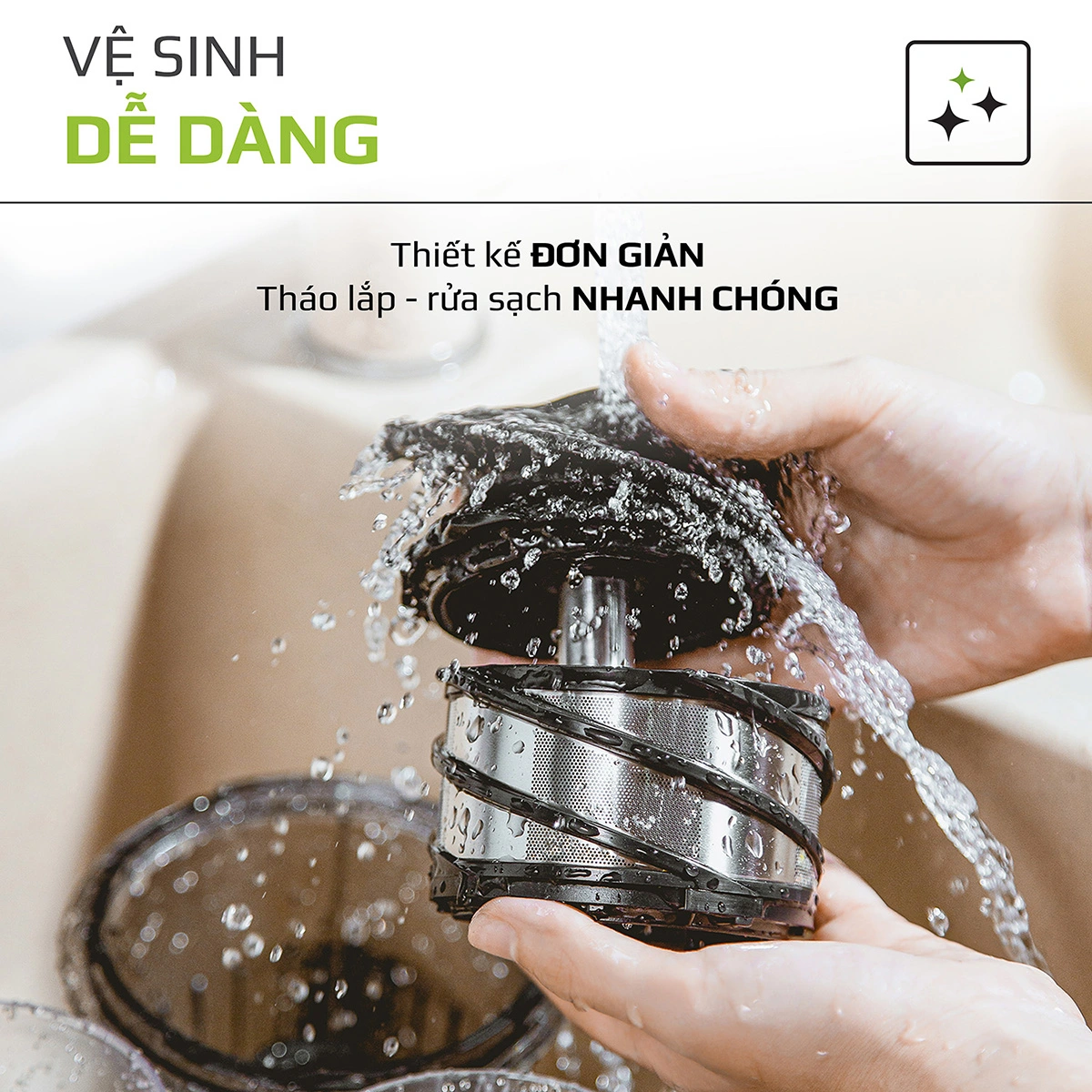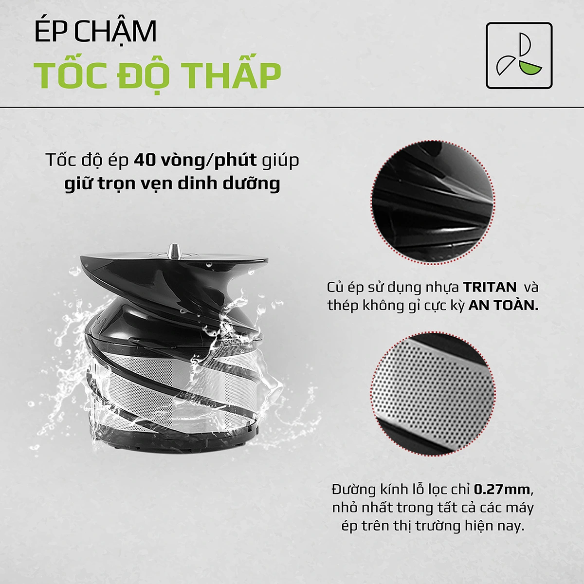 - Tốc độ ép chỉ 40 vòng/phút giúp