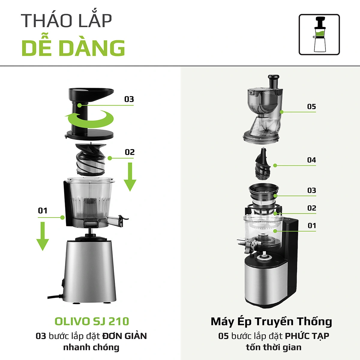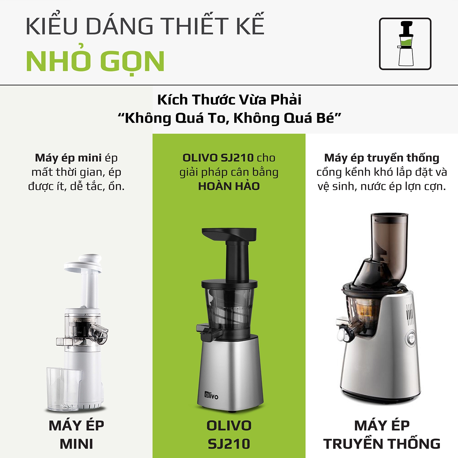- Máy Ép Hoa Quả Chậm OLIVO SJ 210 – Ép hoa quả, trái cây, rau củ, Làm Kem, Làm Sữa Hạt, Sinh Tố. Ép kiệt bã tới 97%, thiết kế nhỏ gọn dễ vệ sinh, dễ dàng tháo lắp, màu sắc sang trọng và đặc biệt không chiếm nhiều diện tích. OLIVO SJ 210 sự lựa chọn tinh tế cho căn bếp nhà bạn.
