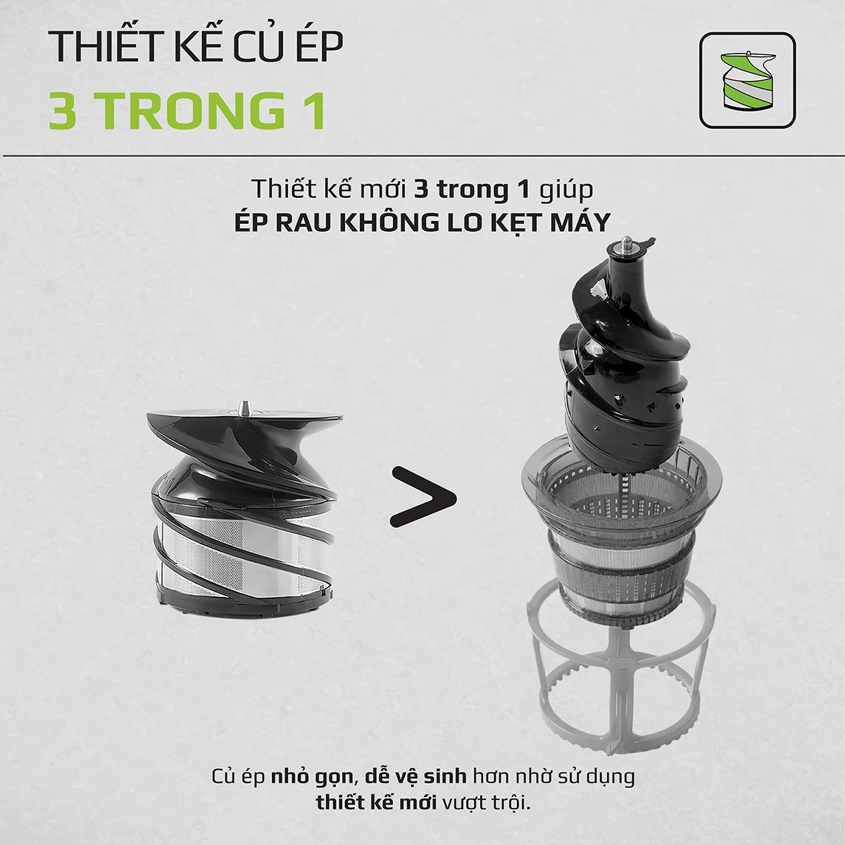 - Thiết kế củ ép mới giúp ÉP RAU KHÔNG LO KẸT MÁY