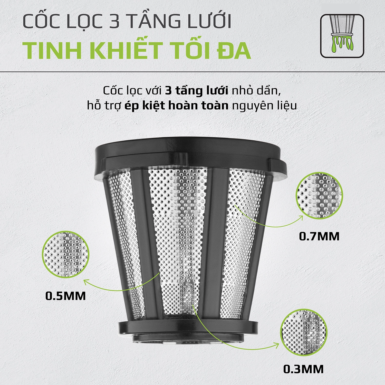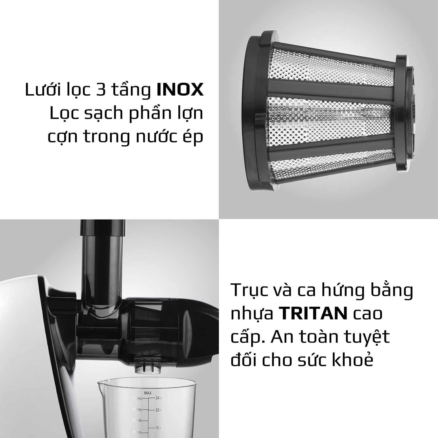 - Cốc lọc với 3 tầng lưới nhỏ dần, hỗ trợ ép kiệt hoàn toàn thực phẩm và cho ra thành phẩm có độ tinh khiết cao nhất.
