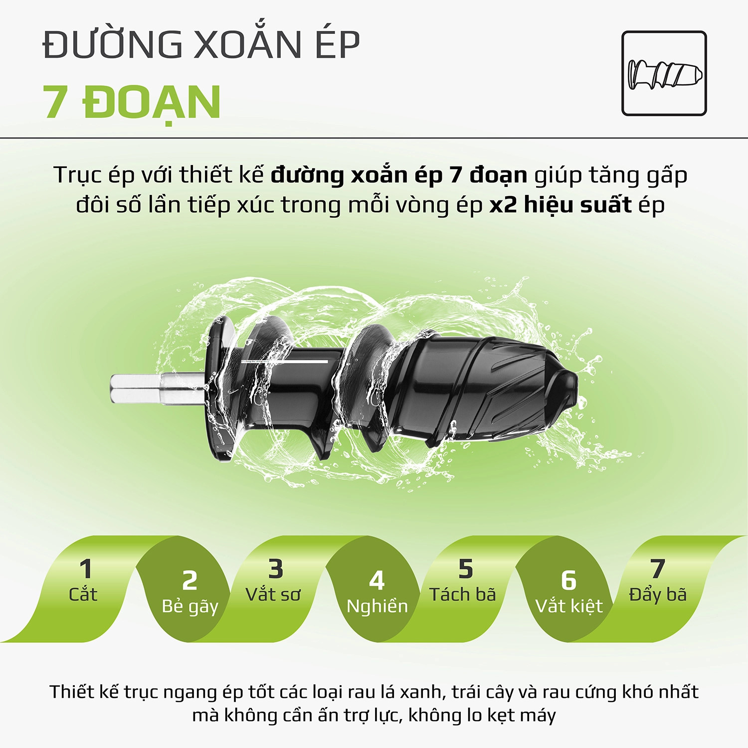 - Đặc biệt, với thiết kế đường xoắn ép 7 đoạn giúp tăng gấp đôi số lần tiếp xúc trong mỗi vòng ép. Đầu trục được thiết kế thu nhỏ dần với các gân hoa khế kết hợp với phần đầu trục vừa khít giúp thực phẩm được vắt kiệt lần cuối trước khi được đẩy ra đồng thời giúp chống kẹt máy.