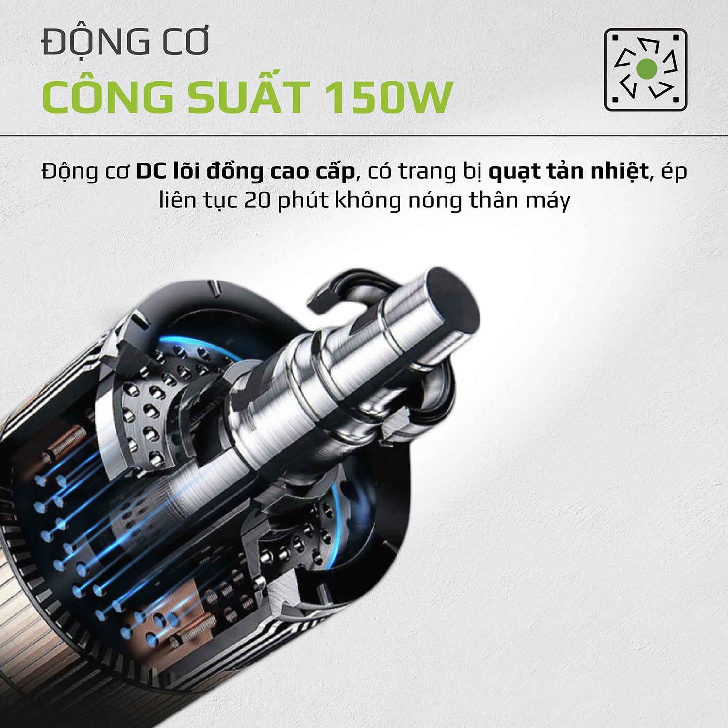 - Được trang bị động cơ DC lõi đồng và quạt tản nhiệt giúp máy có thể hoạt động liên tục không lo nóng máy.