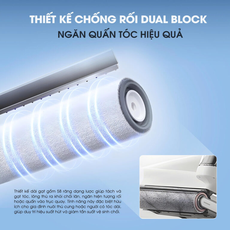 Tính năng này đặc biệt hữu ích cho gia đình có thú cưng hoặc người có tóc dài, giúp duy trì hiệu suất hút ổn định, đồng thời giảm tần suất vệ sinh con lăn, mang lại trải nghiệm dọn dẹp nhẹ nhàng, sạch sẽ và tiện lợi hơn bao giờ hết.