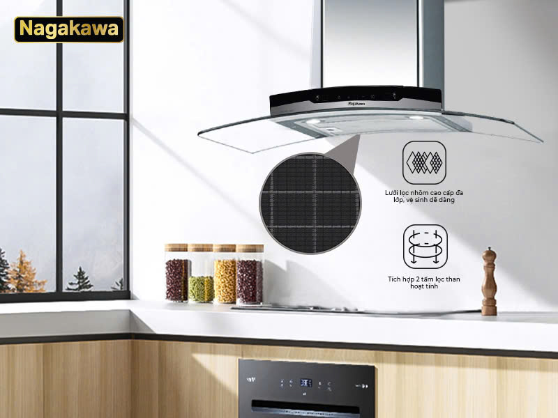Hệ thống lọc than hoạt tính cao cấp Nagakawa hấp thu cặn bẩn, khói bếp,… đồng thời khử mùi hoàn toàn theo tiêu chuẩn của máy lọc không khí, giúp không gian bếp luôn thoáng mát, trong lành để mỗi phút giây của gia đình bạn trong bếp đều thư thái, dễ chịu.