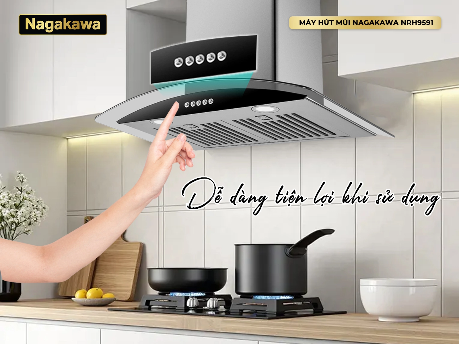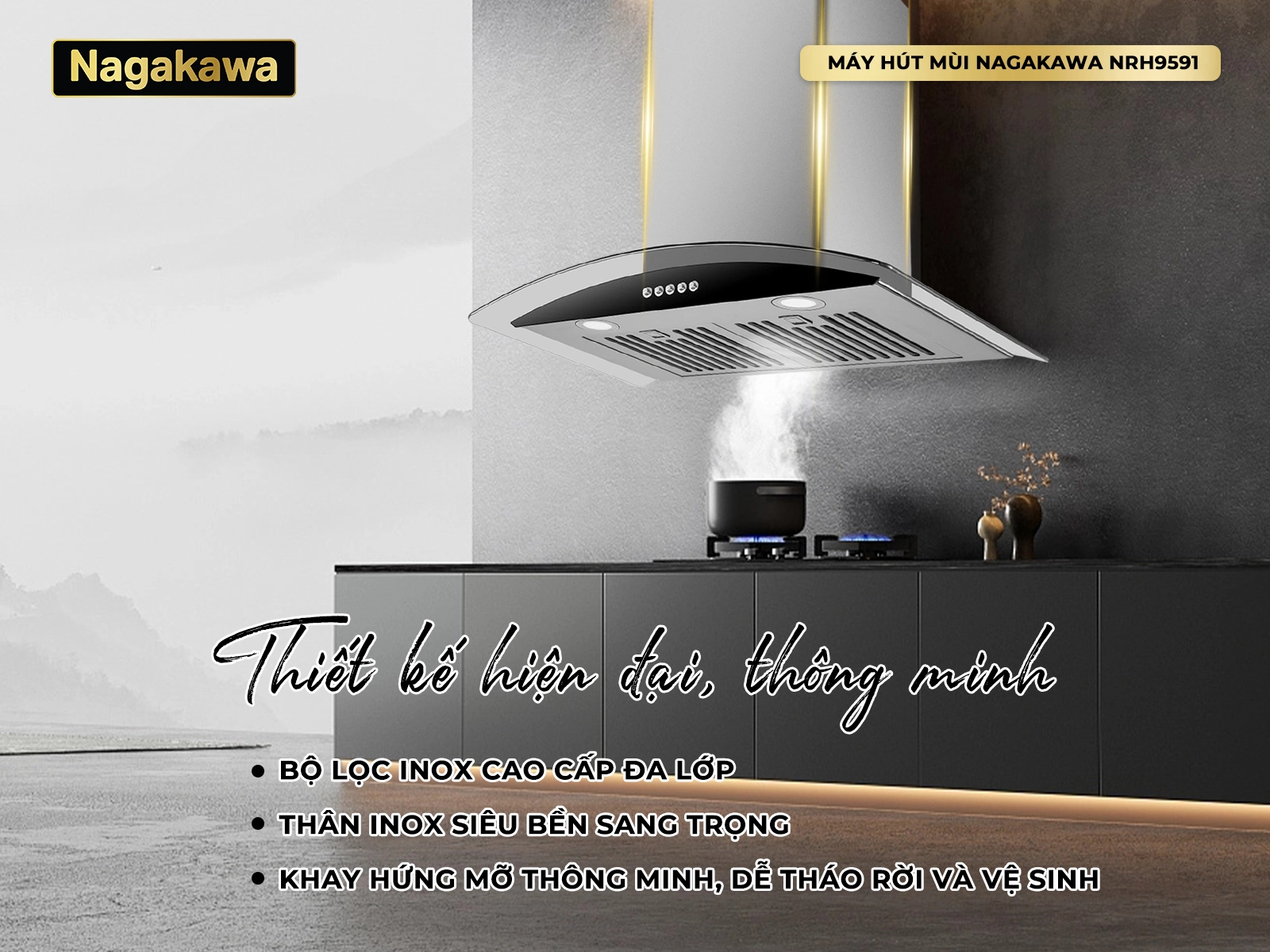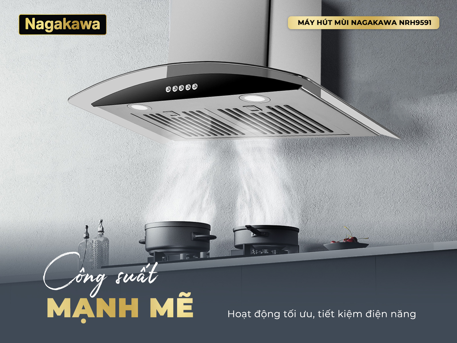 Máy hút mùi Nagakawa NRH9591 mang đến không gian bếp thông thoáng, giúp loại bỏ mùi thức ăn dầu mỡ nhanh chóng giữ cho không khí trong bếp luôn trong lành, sạch sẽ. Với công suất hiệu quả 170W, đảm bảo khả năng hoạt động mạnh mẽ đồng thời vẫn giảm chi phí năng lượng,  tiết kiệm điện so với nhiều thiết bị khác. Sở hữu máy hút mùi NRH959, bạn sẽ chẳng còn lo nấu nướng ám mùi thức ăn lên quần áo, đầu tóc đảm bảo căn bếp luôn sạch đẹp, hiện đại và bảo vệ sức khỏe cho cả gia đình.
