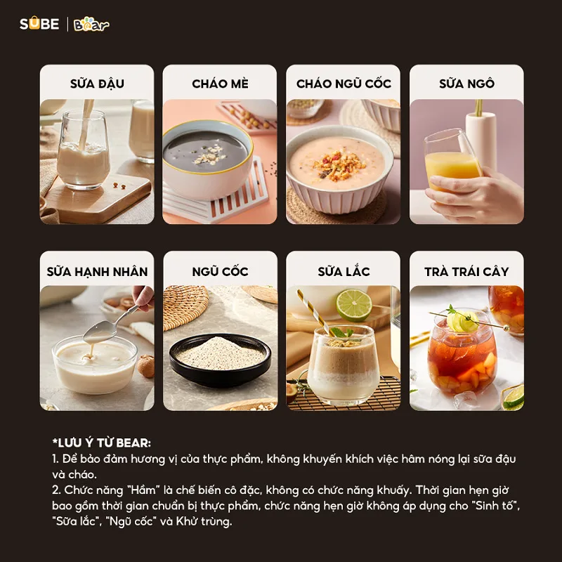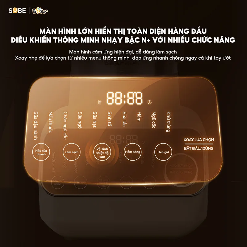 Ngoài các chức năng cơ bản như xay nấu sữa hạt, sữa ngô, sữa đậu nành và sinh tố, máy xay nấu đa năng Bear 1.75L còn có thêm chức năng hầm, nấu cháo, nấu thuốc rất tiện lợi. Phiên bản máy tiếng việt, các chức năng rõ ràng trên màn hình cảm ứng, việc của bạn là chuẩn bị nguyên liệu, các bước còn lại hãy để máy xay SB-SH17V lo.