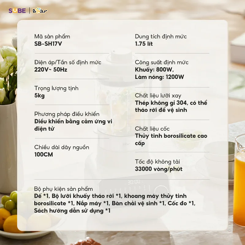 Máy làm sữa hạt Bear 1.75L SB-SH17V với dung tích lớn lên tới 1.75L giúp bạn chăm sóc cả gia đình thân yêu với những ly sữa thơm ngon, bổ dưỡng. Thiết kế thông minh, gồm nhiều tính năng vượt trội giúp việc chuẩn bị các bữa phụ trở nên dễ dàng và tiết kiệm thời gian hơn bao giờ hết. Hãy cùng Bear Việt tìm hiểu về chiếc máy xay đa năng này thông qua bào viết dưới đây nhé!