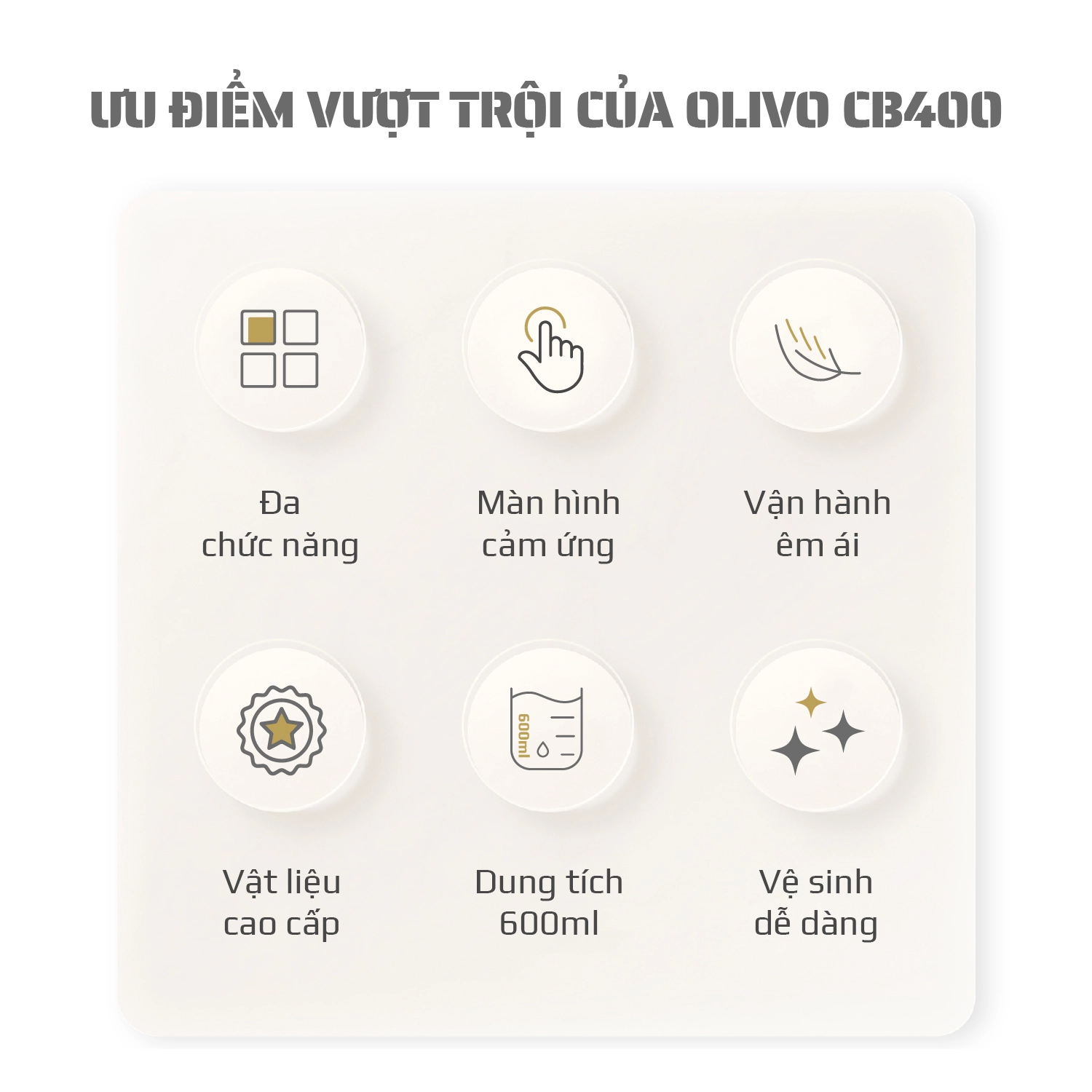 • Các chức năng của OLIVO CB400 PRO được hiển thị bằng icon trên màn hình cảm ứng rõ ràng, chính xác, dễ dàng chọn lựa chương trình mong muốn. Người già hay trẻ nhỏ đều có thể sử dụng được.