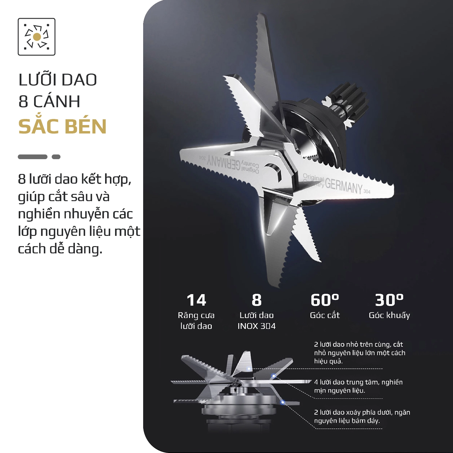 • Lưỡi dao làm từ INOX 304 vừa đảm bảo an toàn cho sức khỏe vừa sắc bén giúp nghiền thực phẩm nhanh và đều hơn. Xử lý gọn được mọi loại hạt cứng một cách dễ dàng.