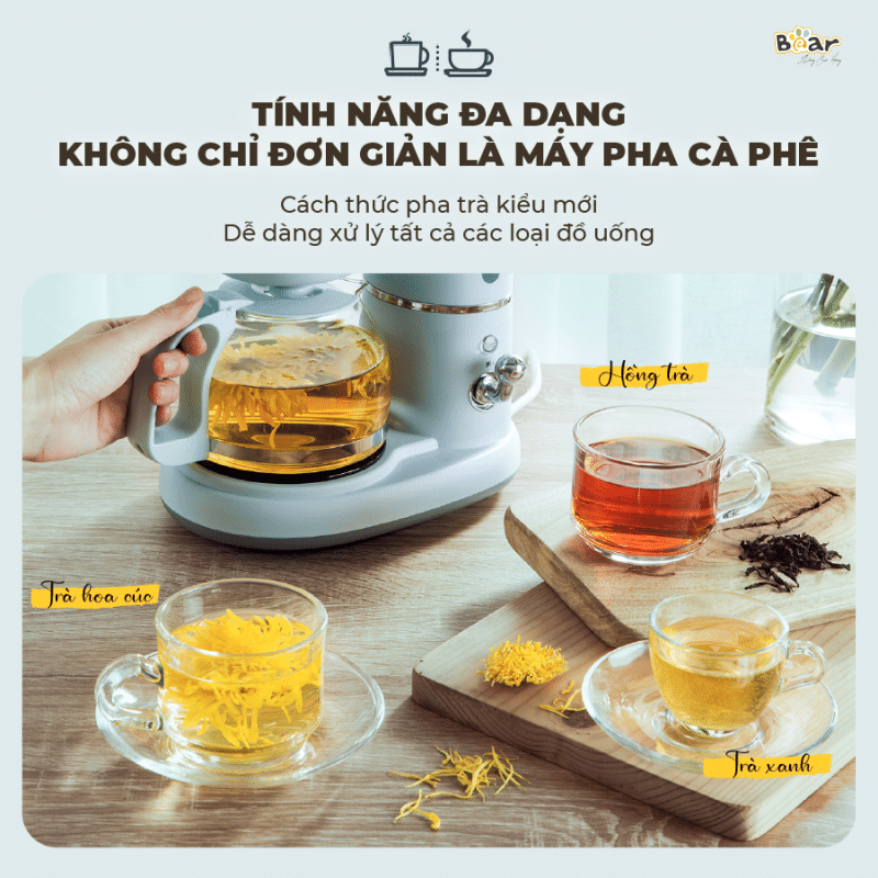 - Chức năng pha cà phê: Chỉ cần cho trà hoặc cà phê cùng nước vào, bật công tắc và máy sẽ tự động hoàn thành phần việc còn lại. Điều này giúp bạn tiết kiệm thời gian và công sức.