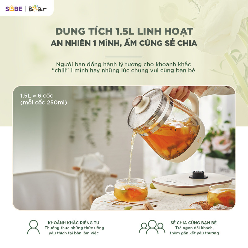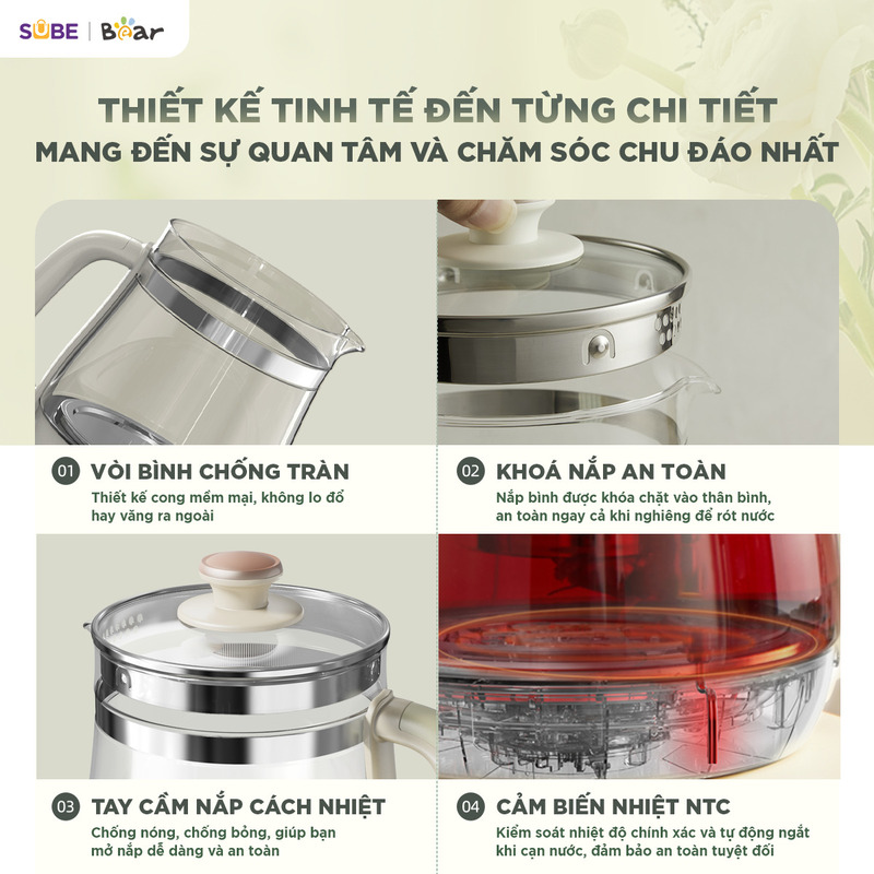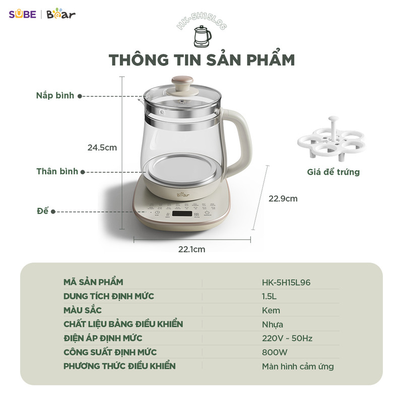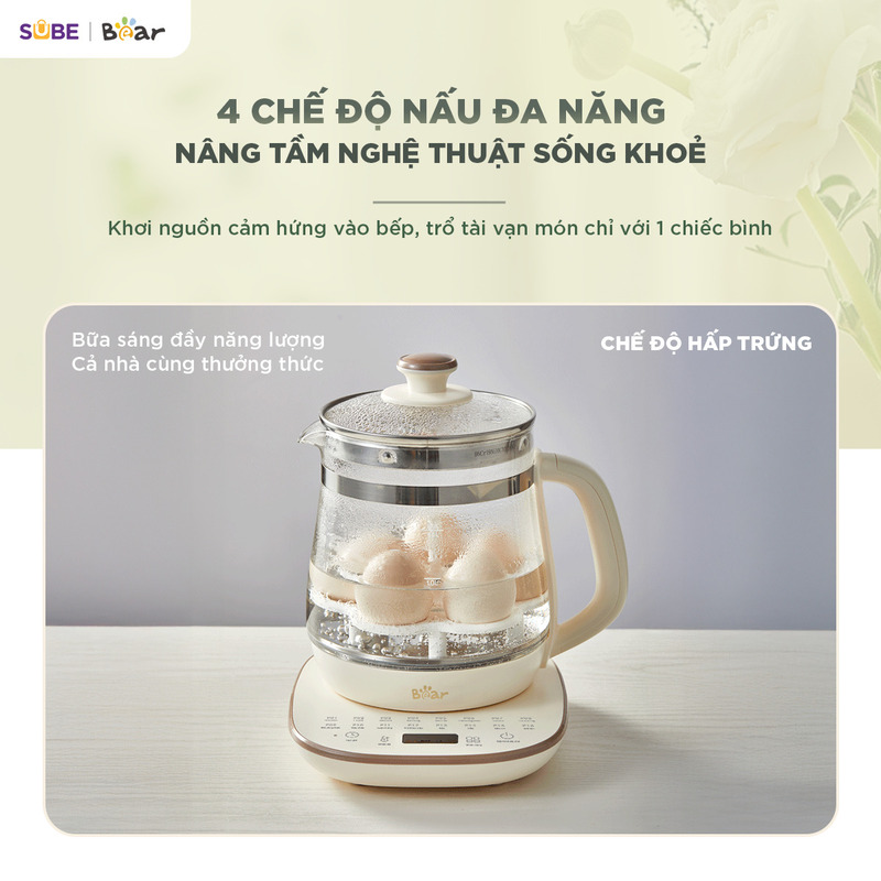 | Chức năng chính | Đun nước, cà phê, hâm sữa, khử trùng, nấu chè, chè dưỡng nhan, trà hoa, trà trái cây, sữa công thức, nấu cháo, luộc trứng, trà thảo mộc, súp, hấp, nấu mì, giữ ấm |