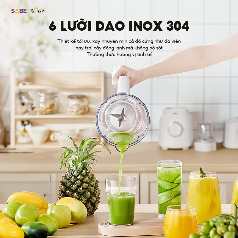 - 6 lưỡi dao xay đa năng: Thiết kế với 6 lưỡi dao, máy xay sinh tố Bear có khả năng xay nhuyễn đa chiều, đảm bảo không bỏ sót bất kỳ nguyên liệu nào.