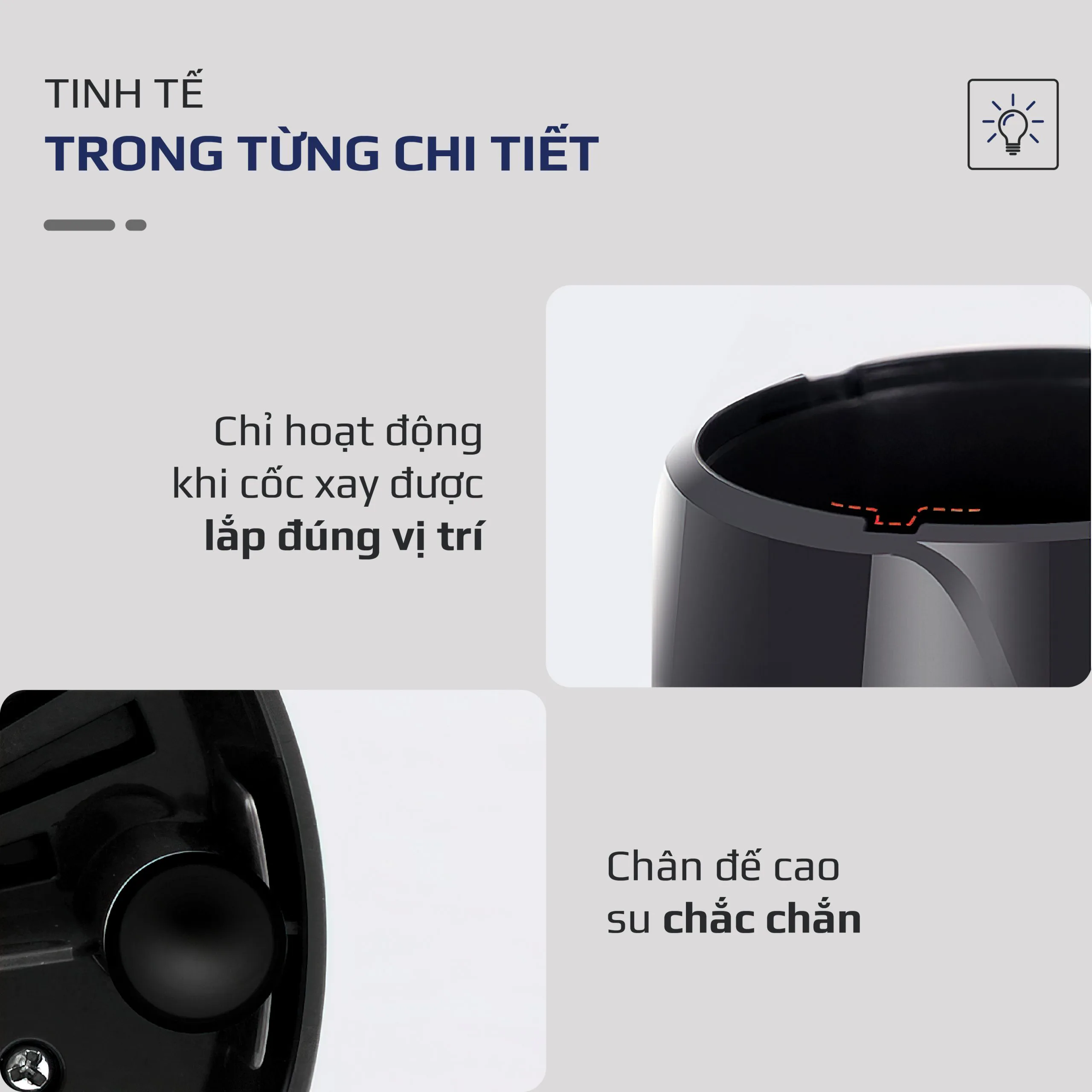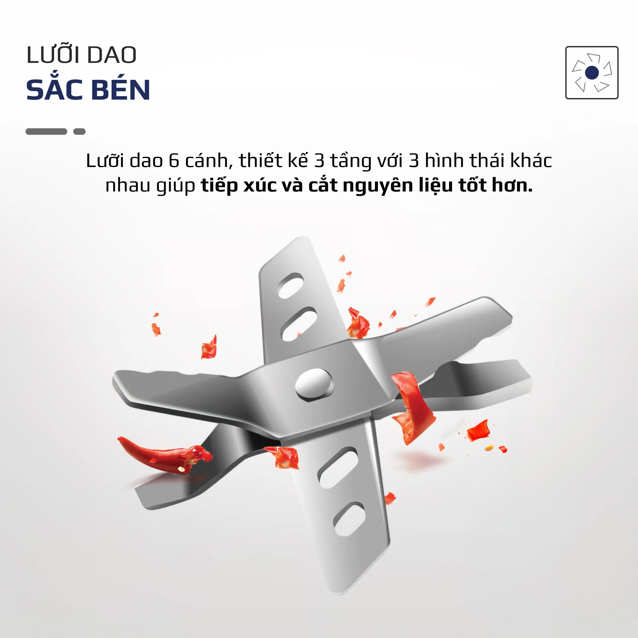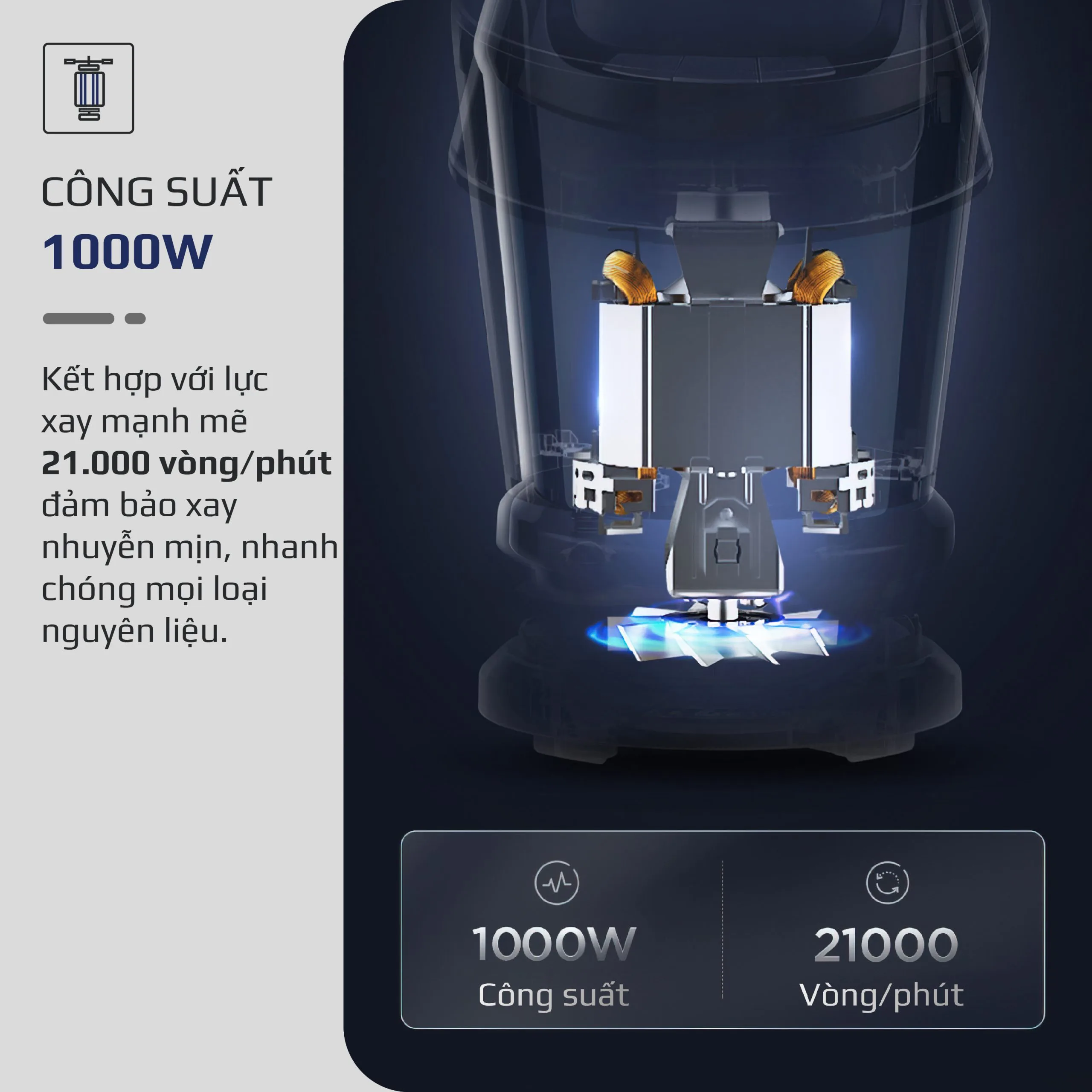 - Công suất xay 1000W, tốc độ xay 21.000 vòng/phút kết hợp với lưỡi dao sắc bén đảm bảo xay nhuyễn mịn mọi loại nguyên liệu.