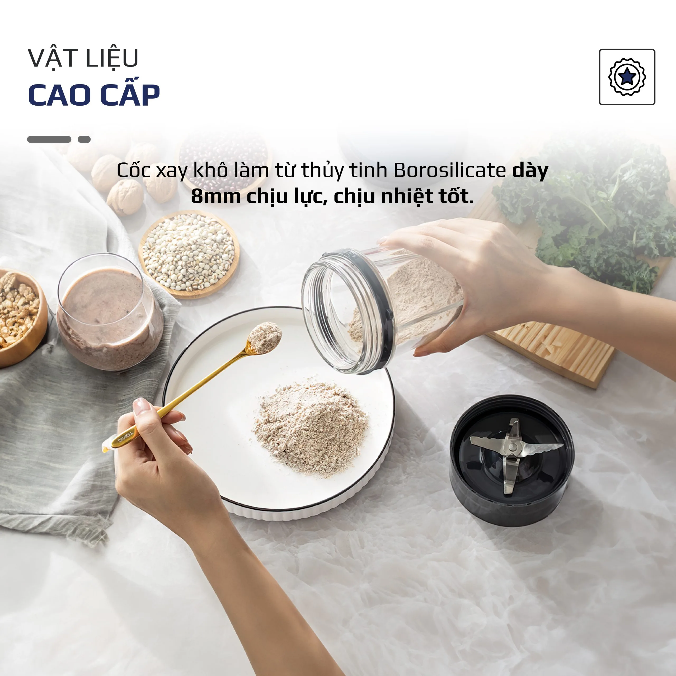 - Cốc xay khô có dung tích 100G được làm từ thủy tinh Borosilicate cao cấp dày 8mm có khả năng chịu lực, chịu nhiệt tốt.