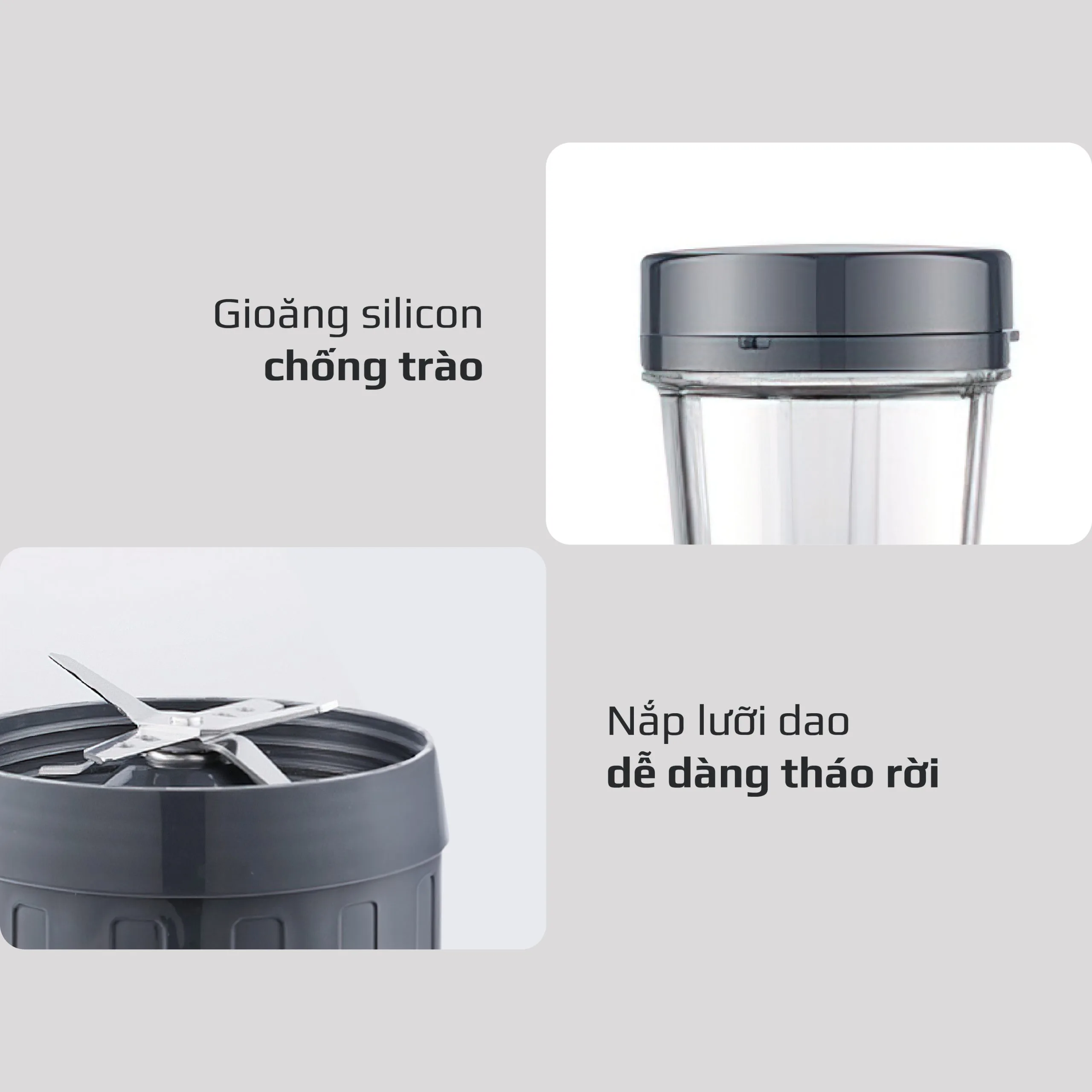 - Bộ sản phẩm bao gồm: thân máy, 3 cốc xay, 1 nắp xay có gắn lưỡi dao, 1 nắp bình bảo quản, 1 nắp có khe cắm ống hút.