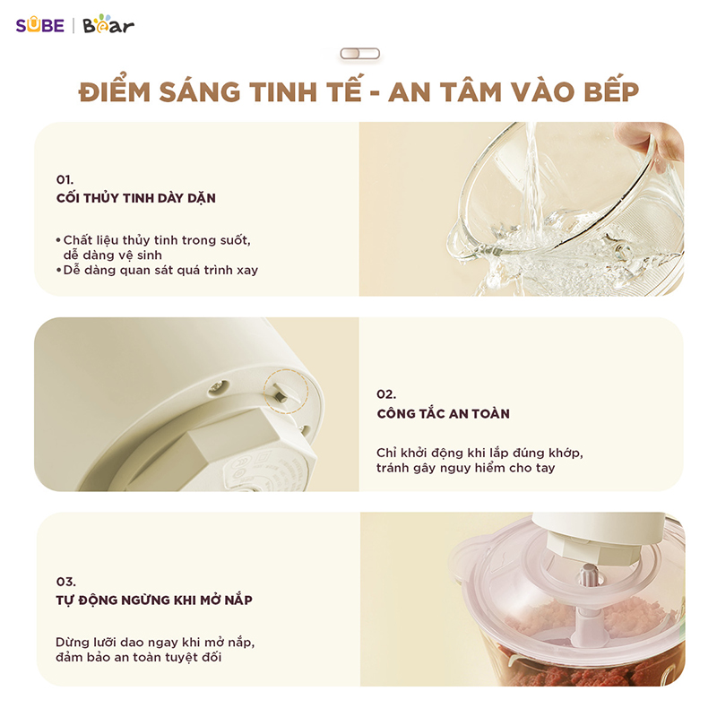 Máy xay thịt Bear 1.8L CH-5H03E33 – Bí quyết để có những món ăn ngon, an toàn cho cả nhà: Không còn nỗi lo thịt xay không rõ nguồn gốc hay vệ sinh kém, Chỉ vài giây để có ngay thịt xay nhuyễn mịn với động cơ 300W siêu khỏe. Hãy cùng Bear khám phá chiếc máy xay thịt tiện lợi này nhé!