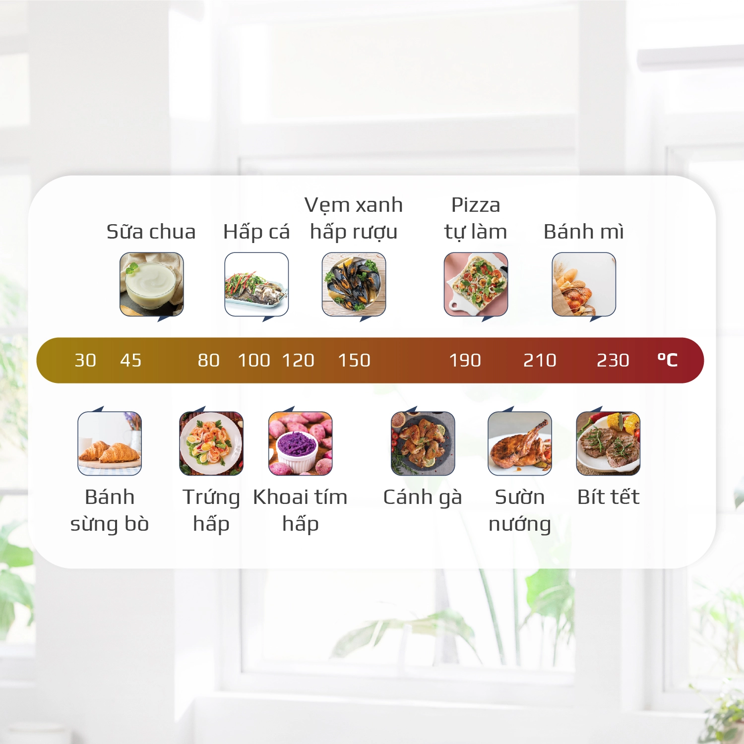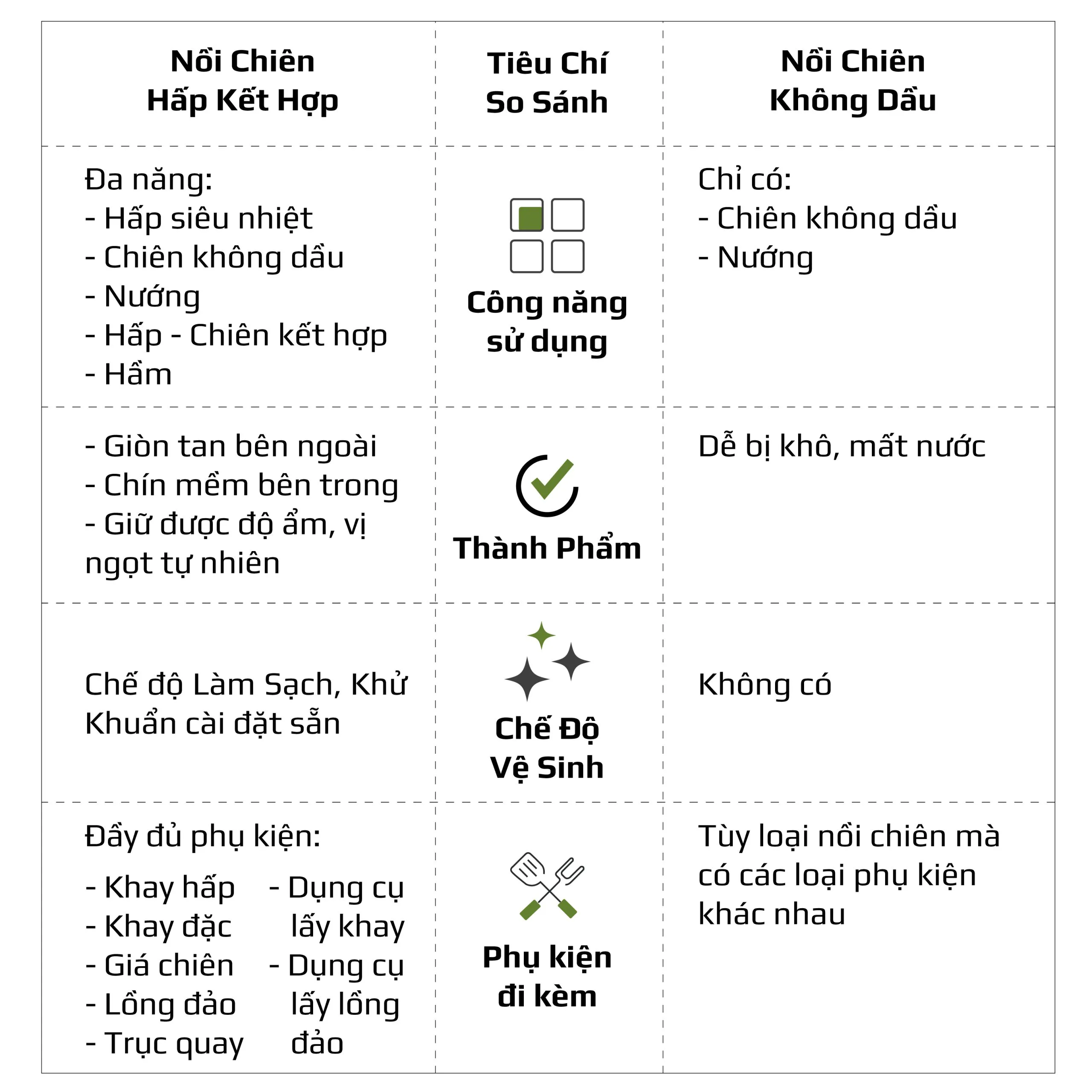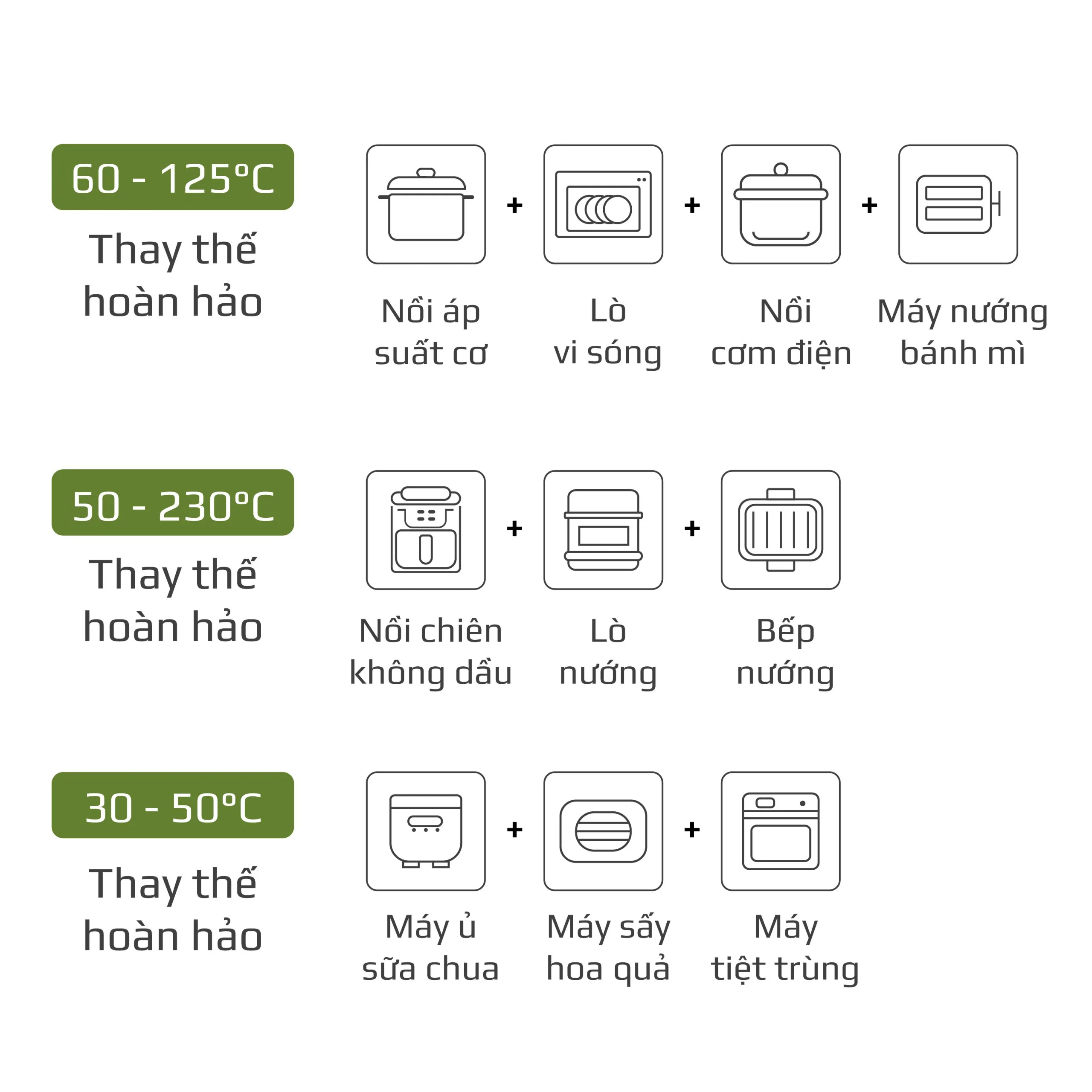 • Chiên không dầu chiên đồ ăn vàng giòn mà không cần dùng đến dầu mỡ, giảm đến 95% lượng dầu mỡ dư thừa trong bữa ăn hàng ngày. Trong khi đó, hấp đồ ăn bằng hơi nước siêu nhiệt giúp giảm thời gian hấp, đồng thời bảo toàn tối đa dinh dưỡng có trong thực phẩm.