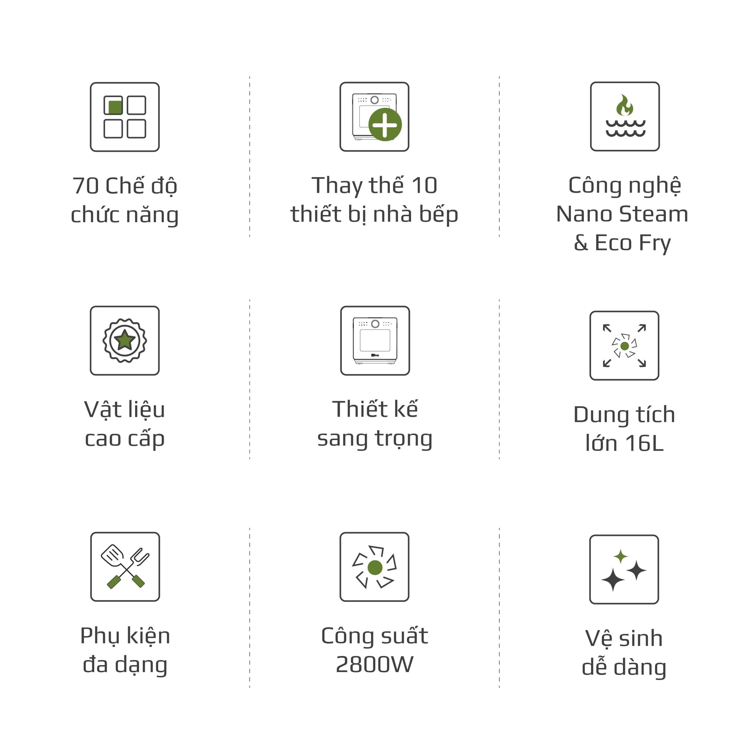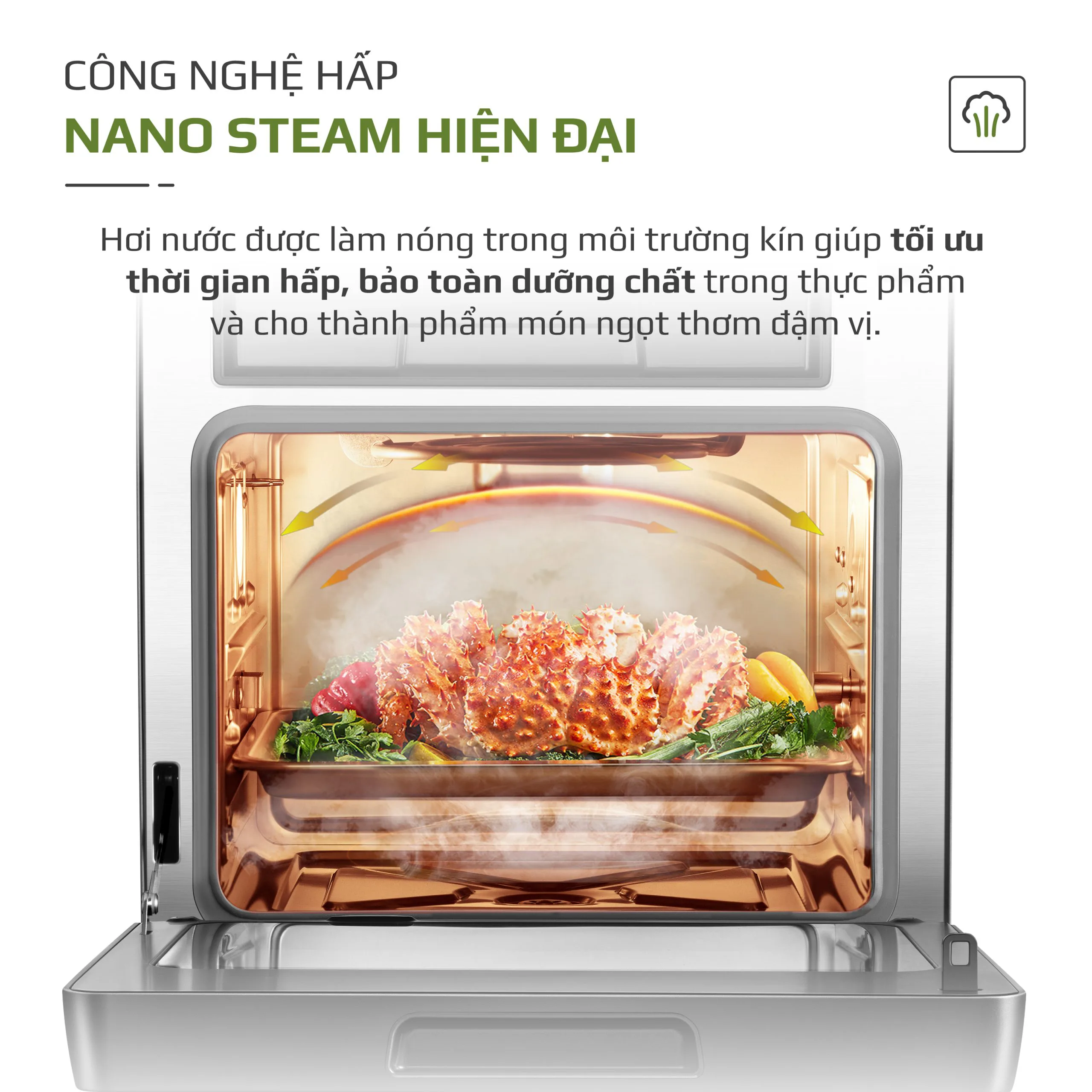 • Sản phẩm ứng dụng công nghệ Nano Steam làm nóng hơi nước trong môi trường kín kết hợp hệ thống phun hơi nước siêu nhiệt giúp bảo toàn dưỡng chất trong thực phẩm, tối ưu thời gian nấu. Cho thành phẩm món hấp ngọt thơm, đậm vị.