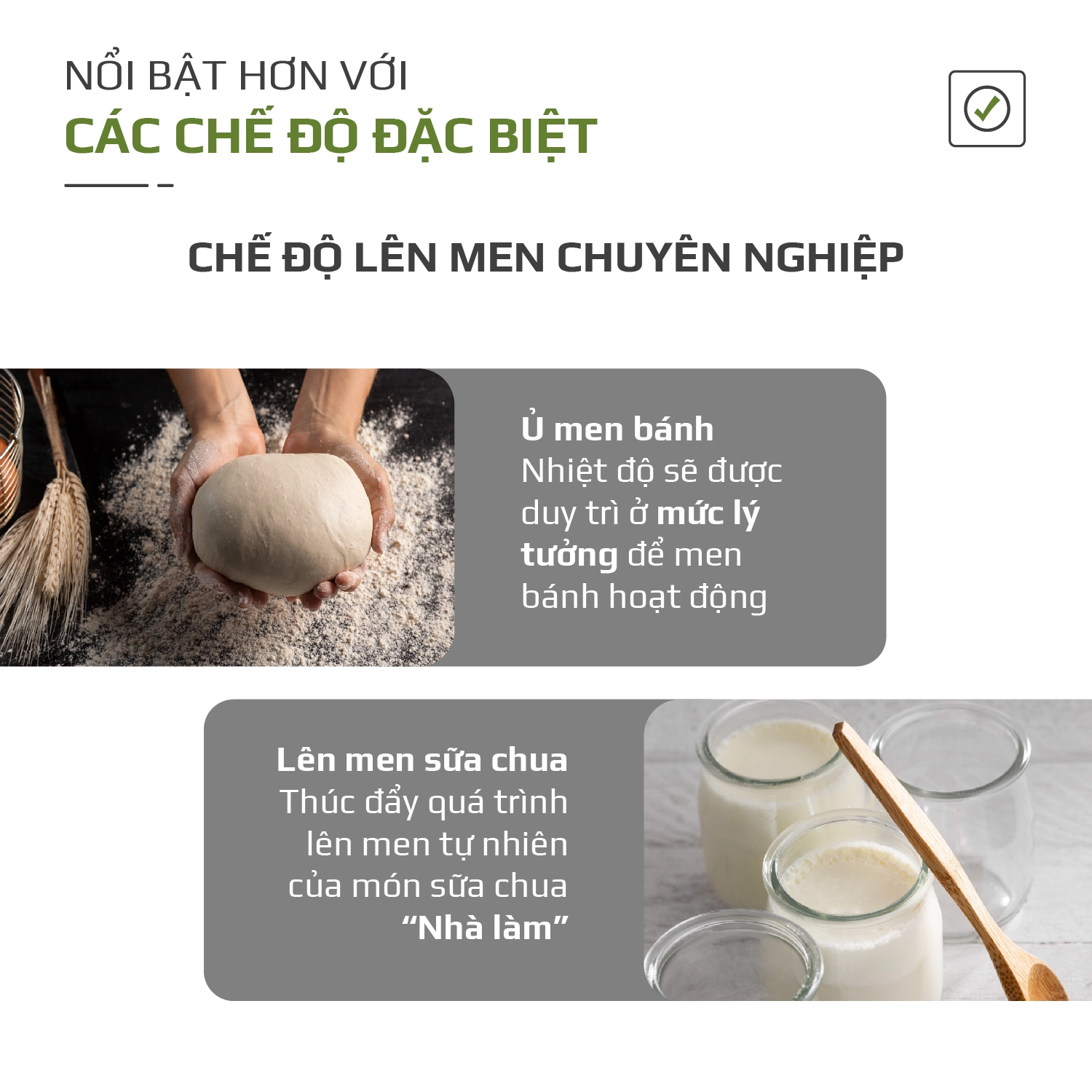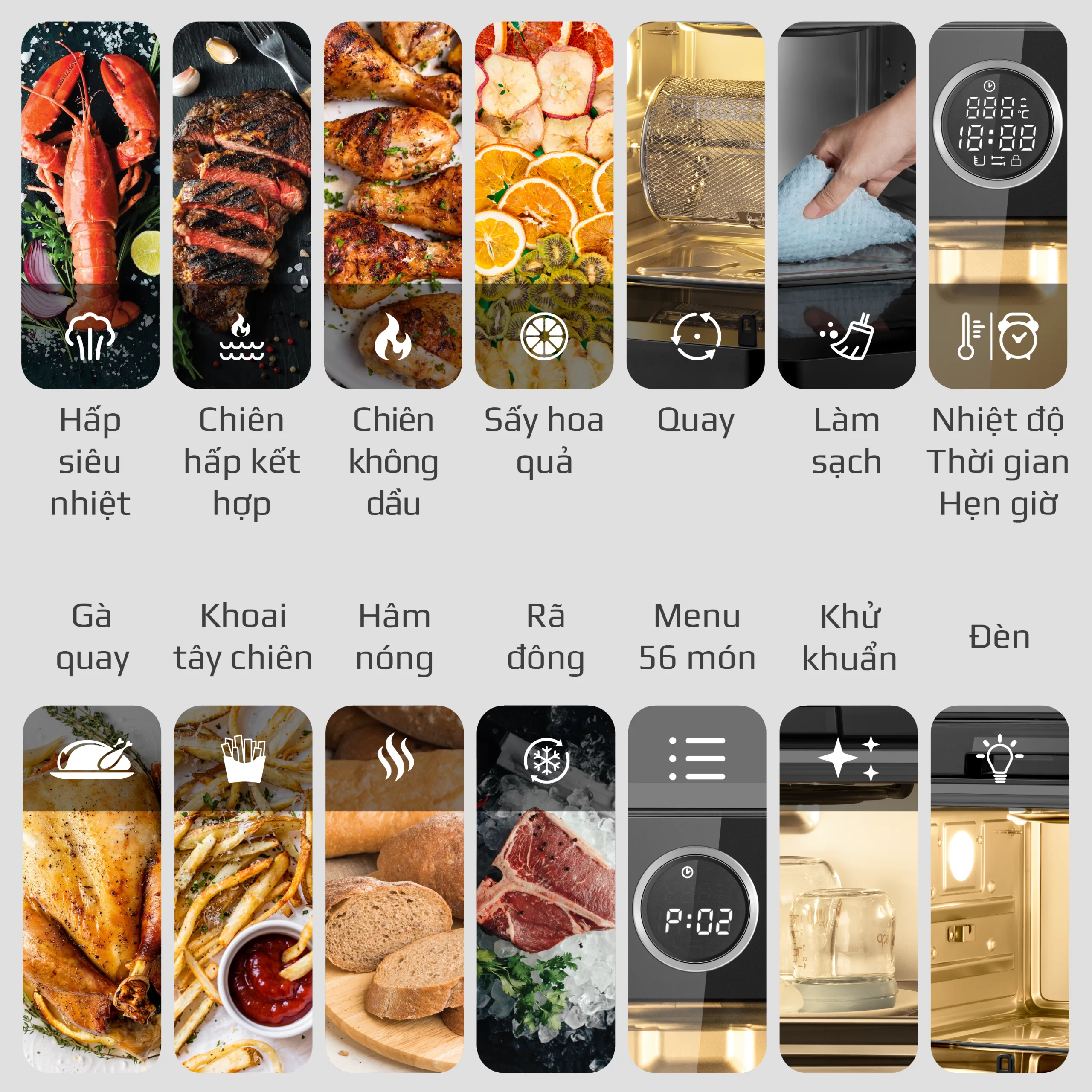 • Ngoài 13 chương trình setup trên bảng điều khiển bên ngoài, còn có menu 56 món cài đặt sẵn phù hợp với ẩm thực và phong tục chế biến món ăn của người Việt.