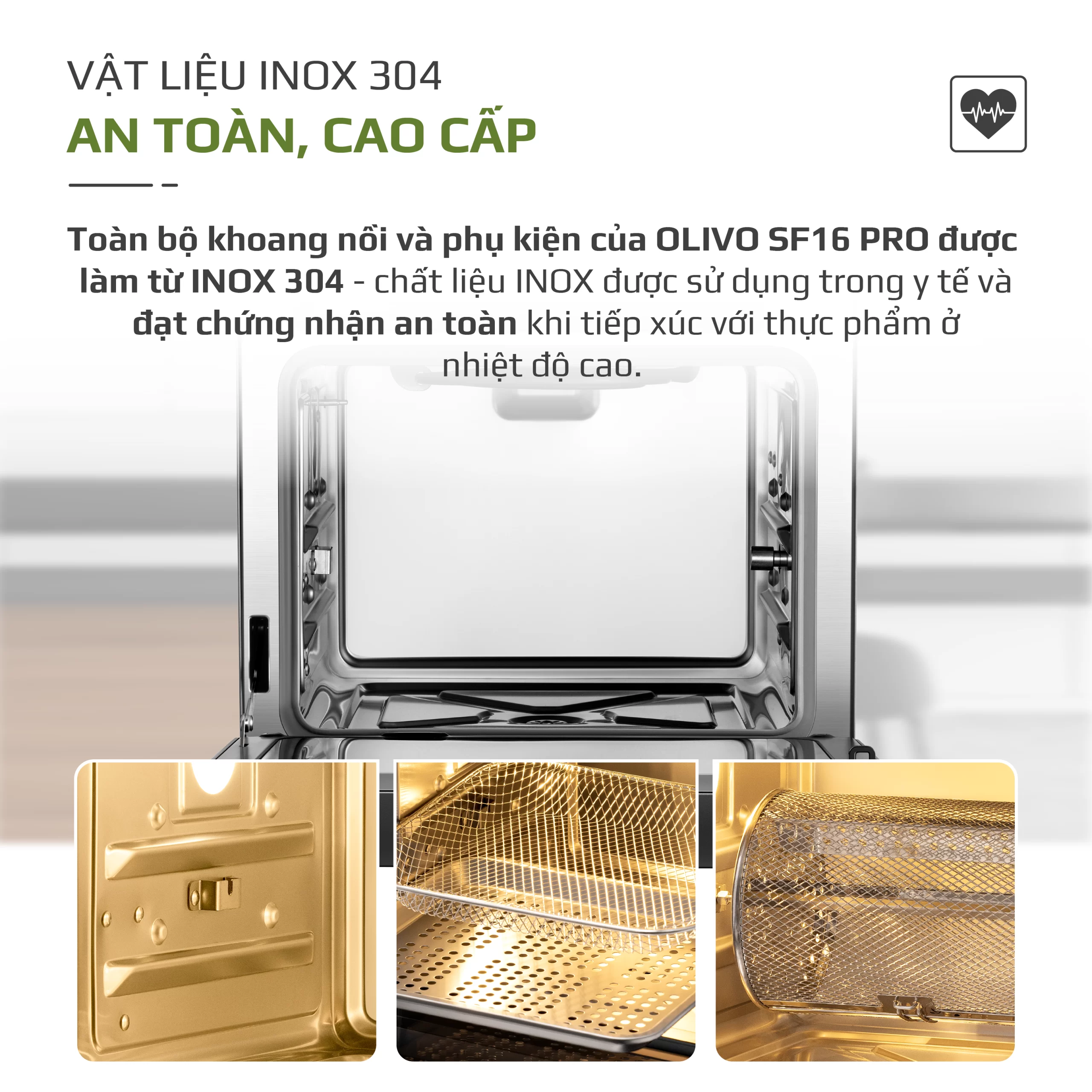 • Đặt sức khoẻ của khách hàng làm tiêu chí hàng đầu, khoang nồi của Nồi chiên hấp OLIVO SF16 PRO được làm từ INOX 304 cao cấp, an toàn với sức khỏe người dùng. Chất liệu INOX cũng cho nồi khả năng dẫn nhiệt và giữ nhiệt tốt vượt trội.