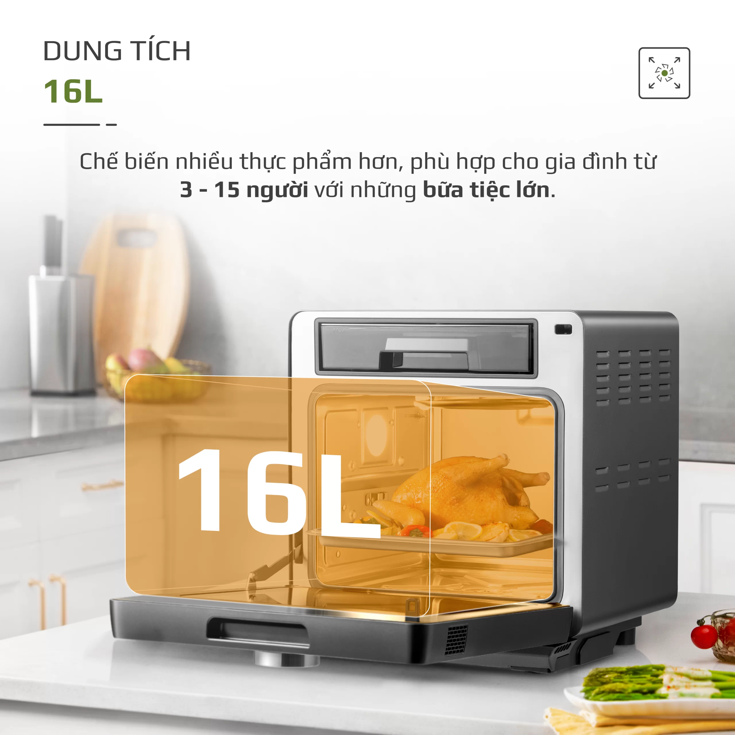 • Khoang nồi với dung tích lên đến 16 lít, bạn hoàn toàn có thể quay gà nguyên con cỡ 2-3kg.