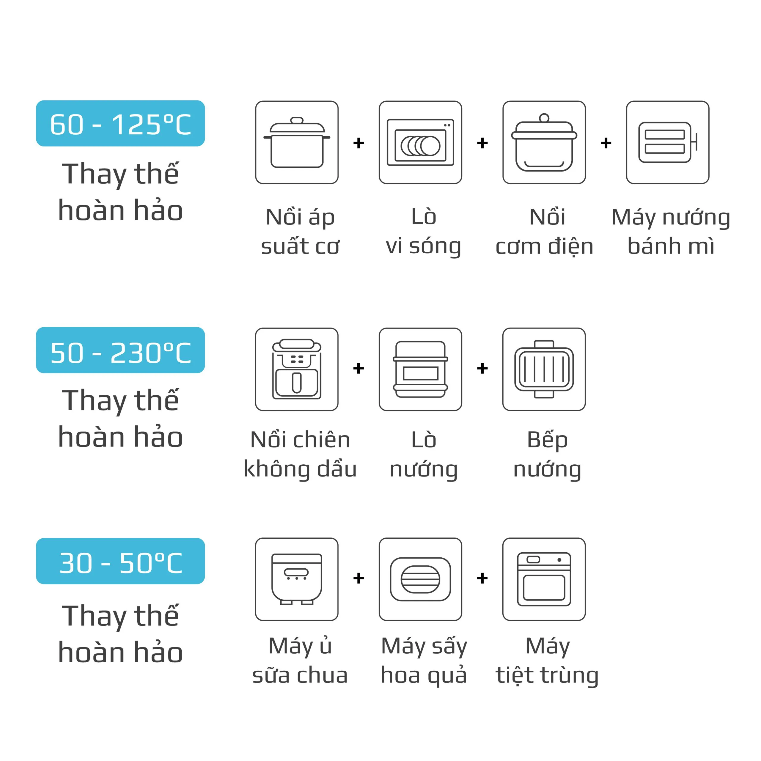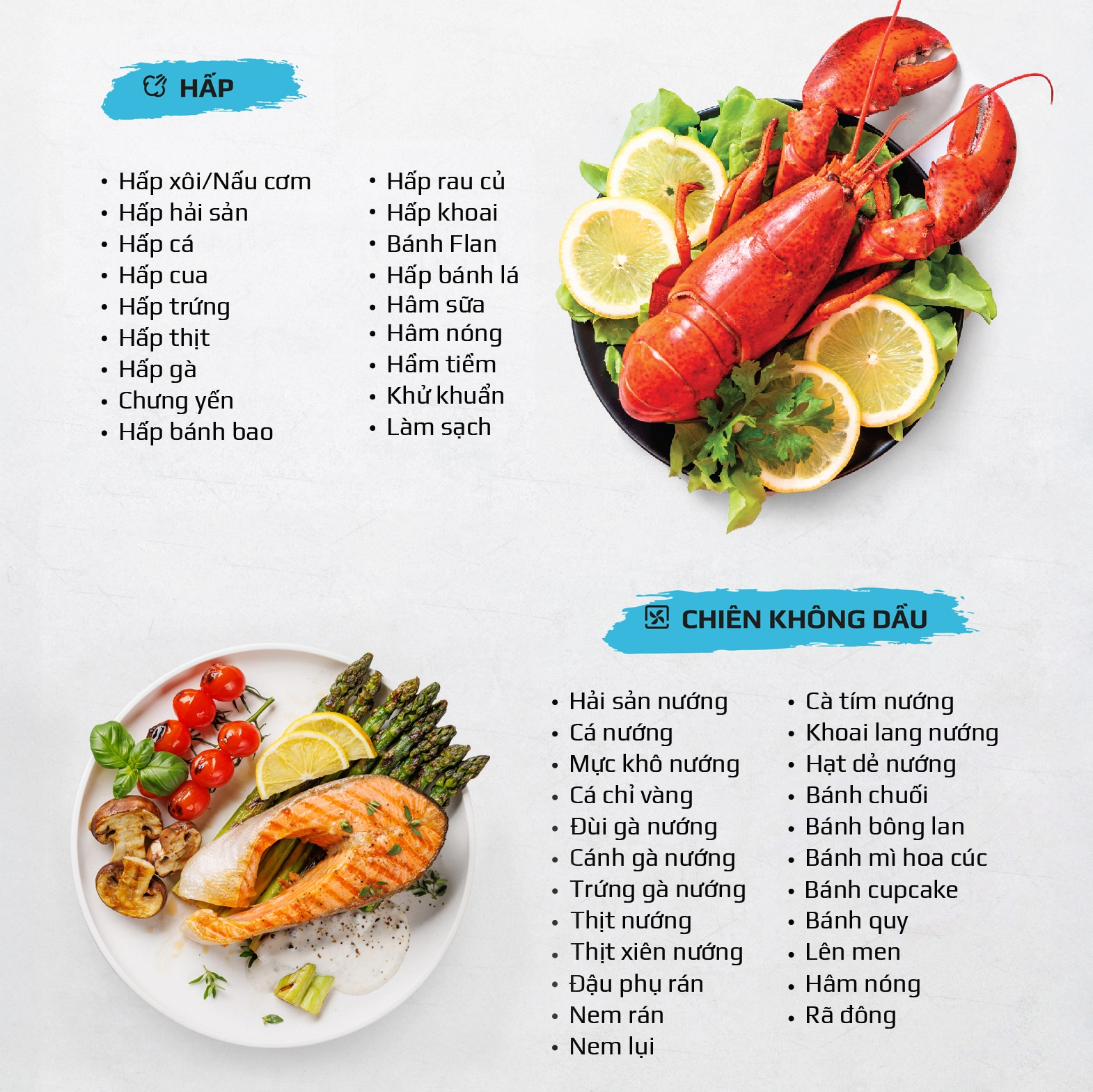 Chiên không dầu chiên đồ ăn vàng giòn mà không cần dùng đến dầu mỡ, giảm đến 95% lượng dầu mỡ dư thừa trong bữa ăn hàng ngày. Trong khi đó, hấp đồ ăn bằng hơi nước siêu nhiệt giúp giảm thời gian hấp, đồng thời bảo toàn tối đa dinh dưỡng có trong thực phẩm.