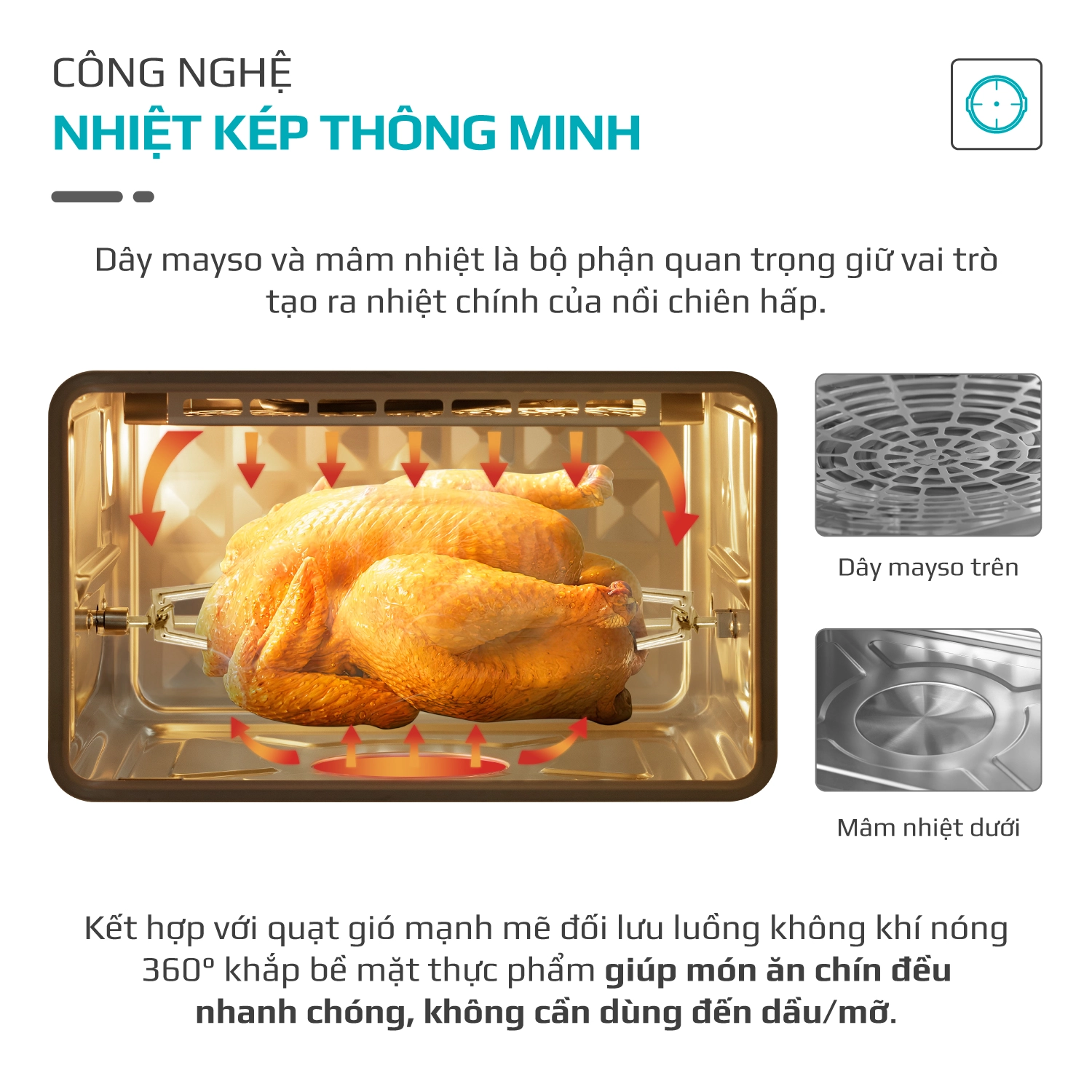 Tạo luồng không khí nóng: Công nghệ này sử dụng quạt để tạo ra luồng không khí nóng mạnh mẽ, tuần hoàn đều khắp khoang nồi.